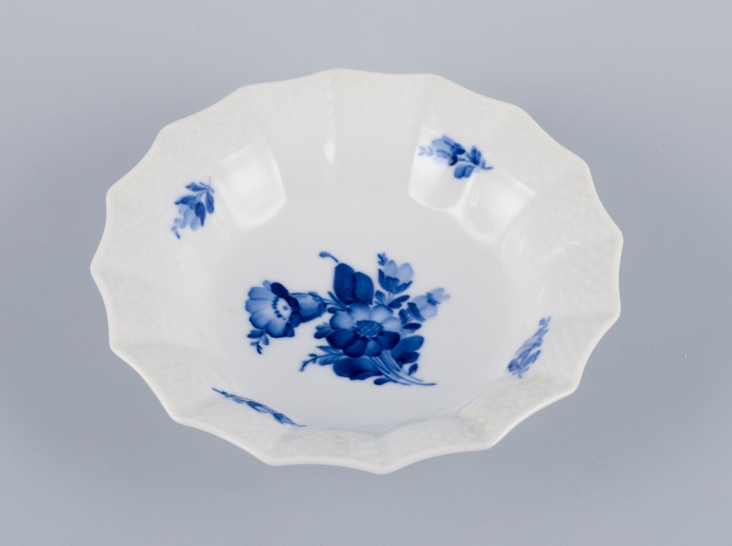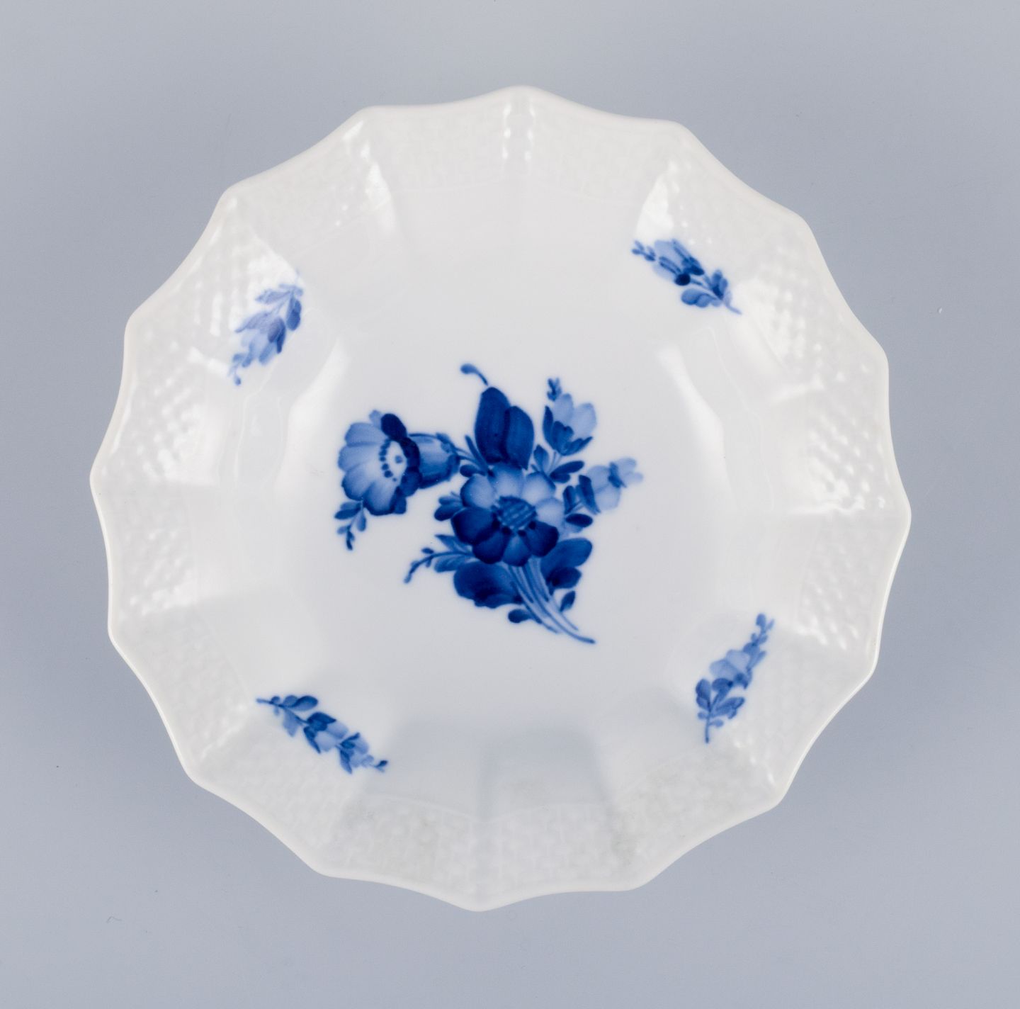 Royal Copenhagen, Blå Blomst, opsats og skål i håndmalet porcelæn.