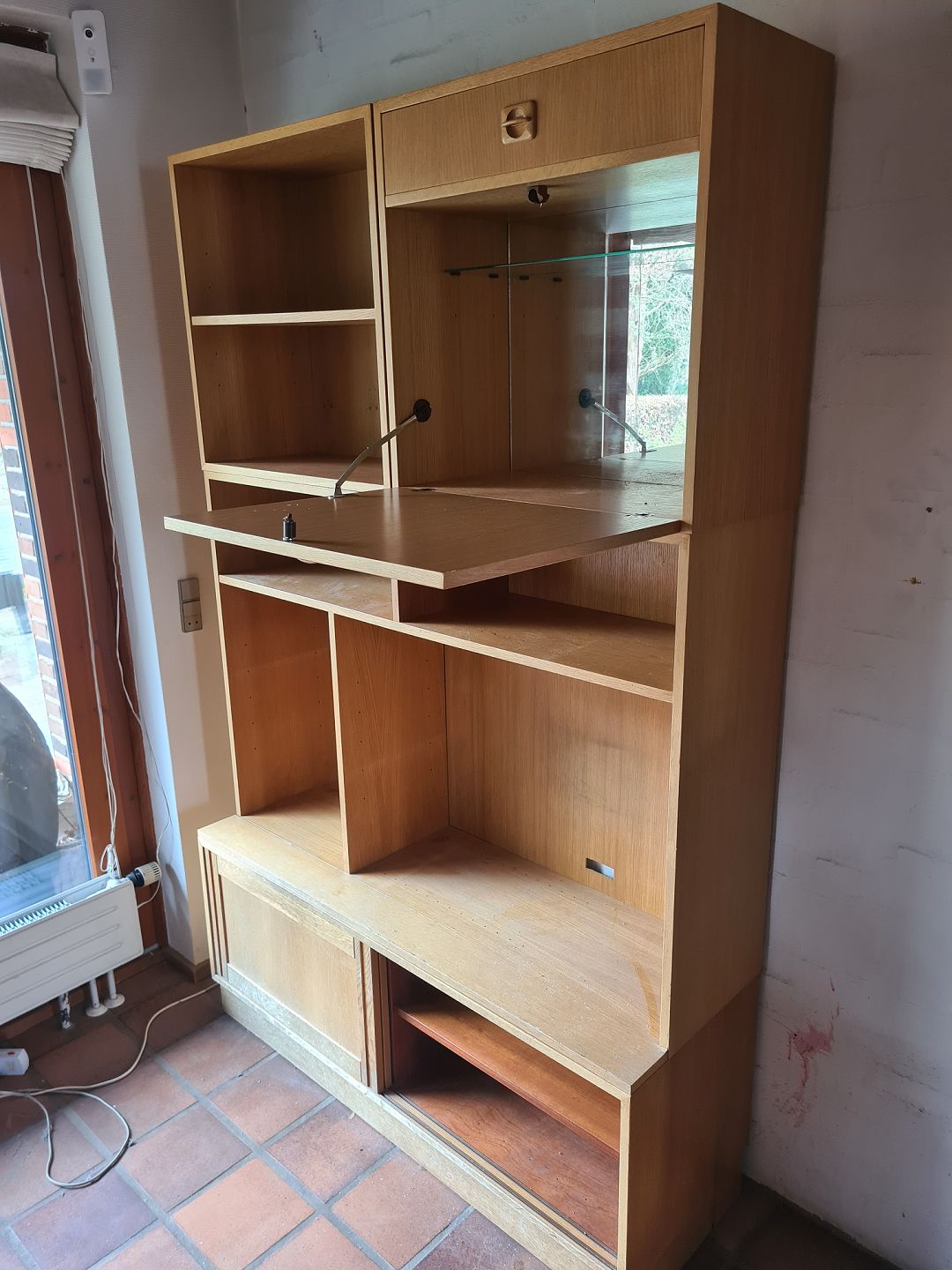 4 delt reolsektion i fineret egetræ, fra 1970erne.
