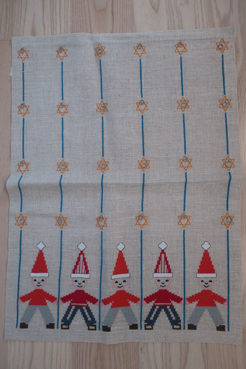 Smuk, gammel, håndbroderet pakkekalender med ringe til at binde pakkerne fast i