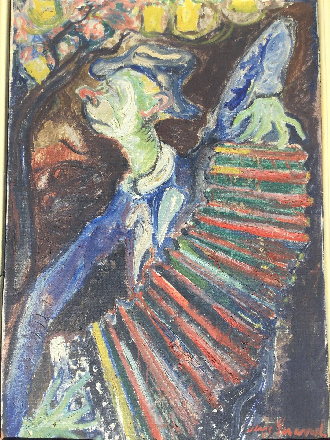 Maleri af Aage Strand - Hamonikaspillende klovn.