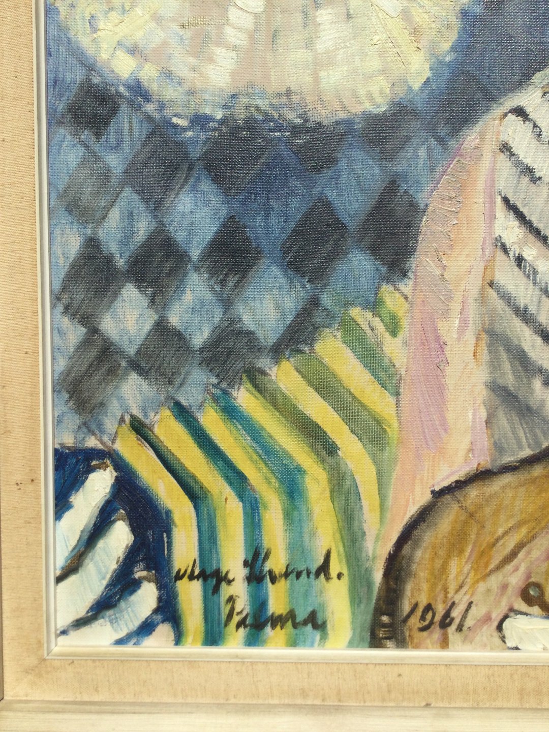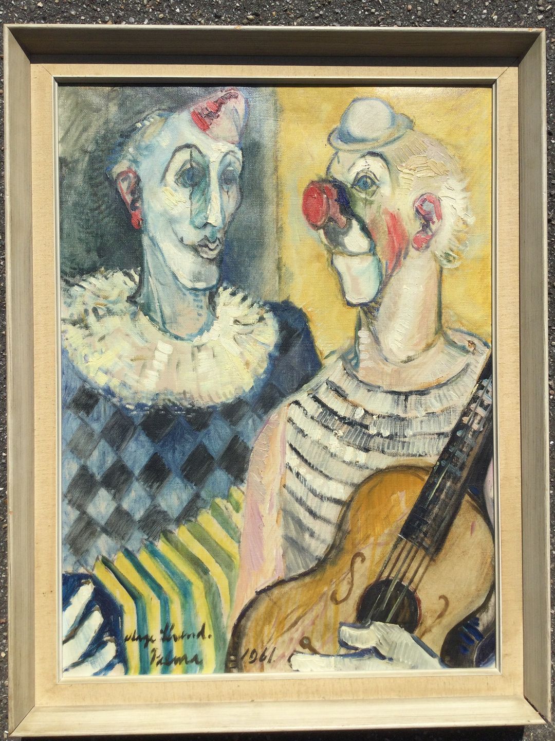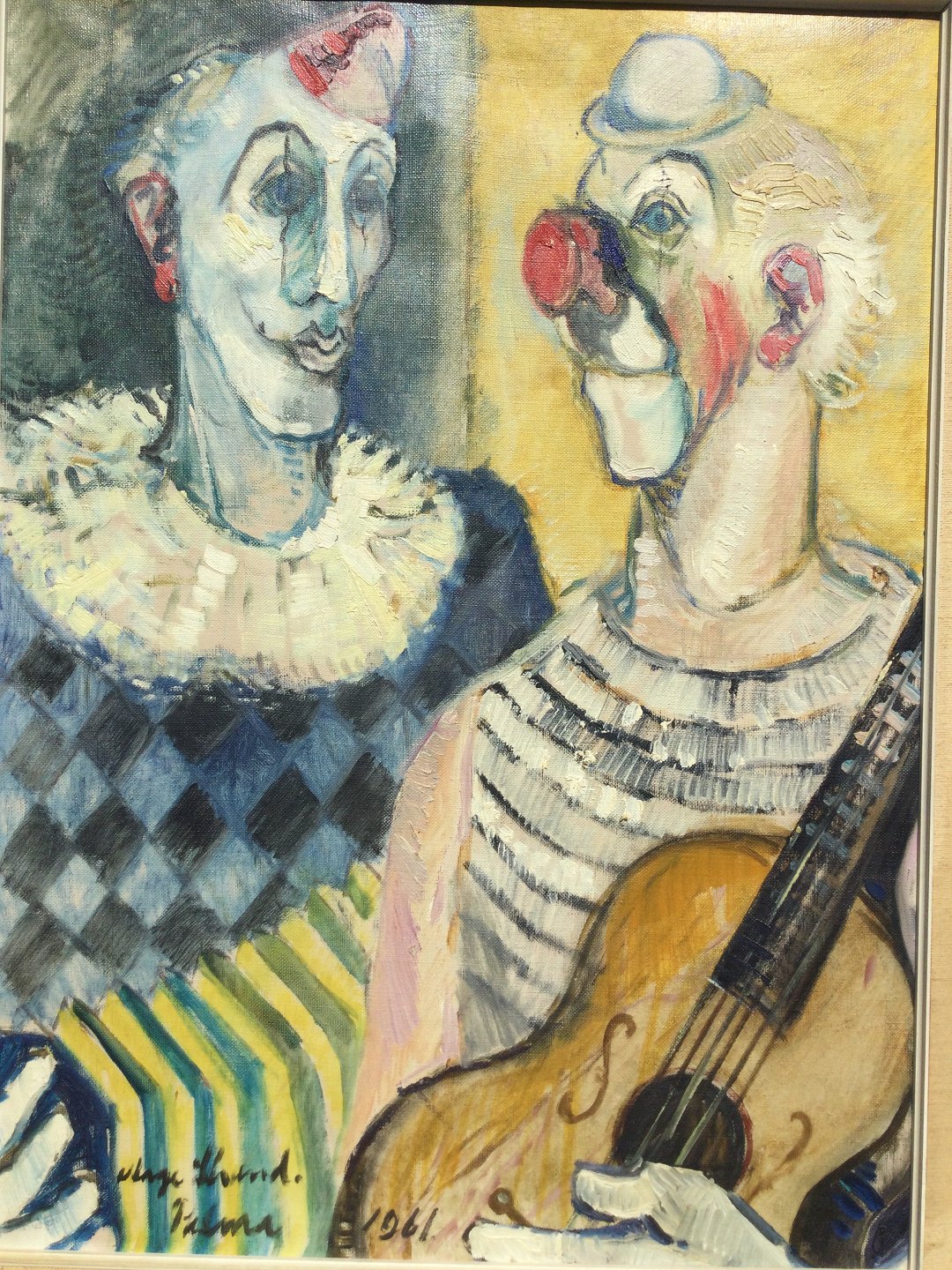 Maleri af Aage Strand - 2 musicerende klovne, Palma 1961.