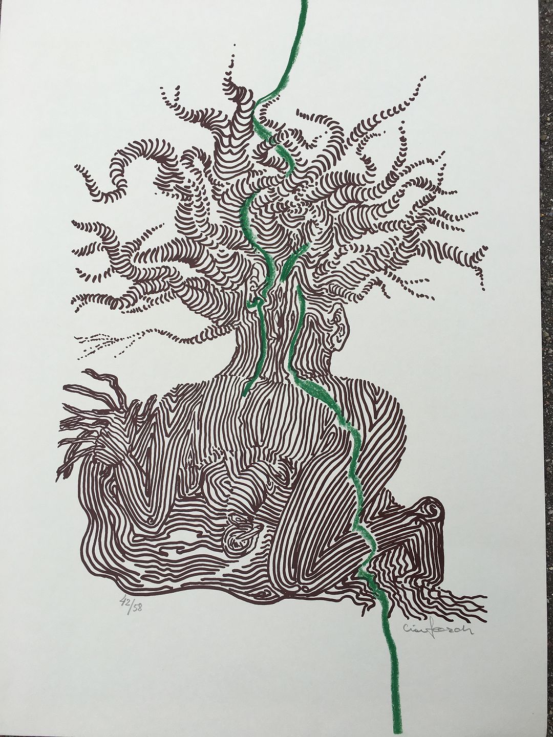 Litografi af Lise Færch - komposition med træ, rødder og menneske.