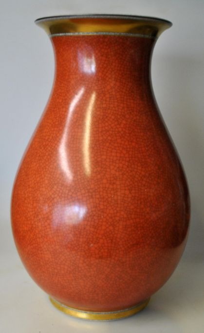 Royal Copenhagen craquelle vase, 212/6547, 20th century Copenhagen, Denmark. Gray qraquelle glaze with orange overglaze and gilding. Stamped. Height.: 30.2 cm.