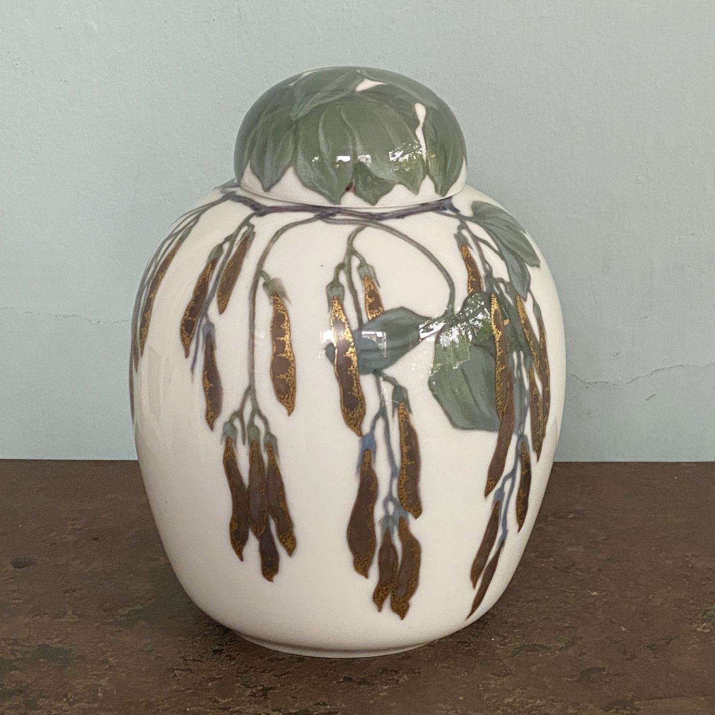 Royal Copenhagen lågkrukke / urne dekoreret i underglasur med guldregn og i overglasur med mariehøns og guld.