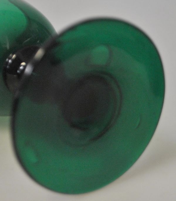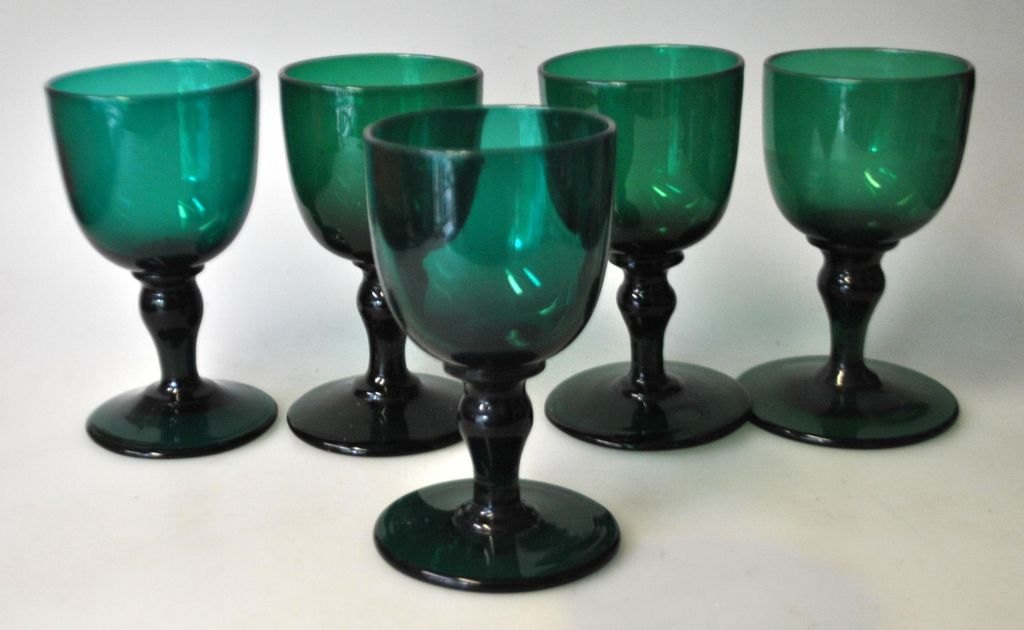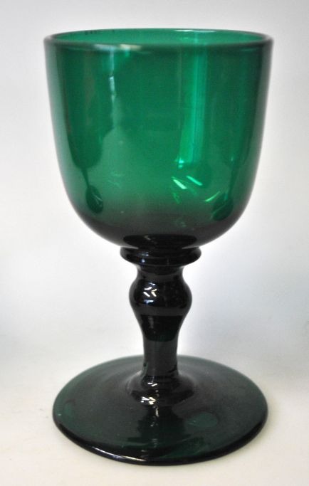 Samling grønne hvidvins glas, medio 19. årh. Danmark. Med omvendt balsterformet stilk. Ægformet kumme. H.: 11,5 cm.