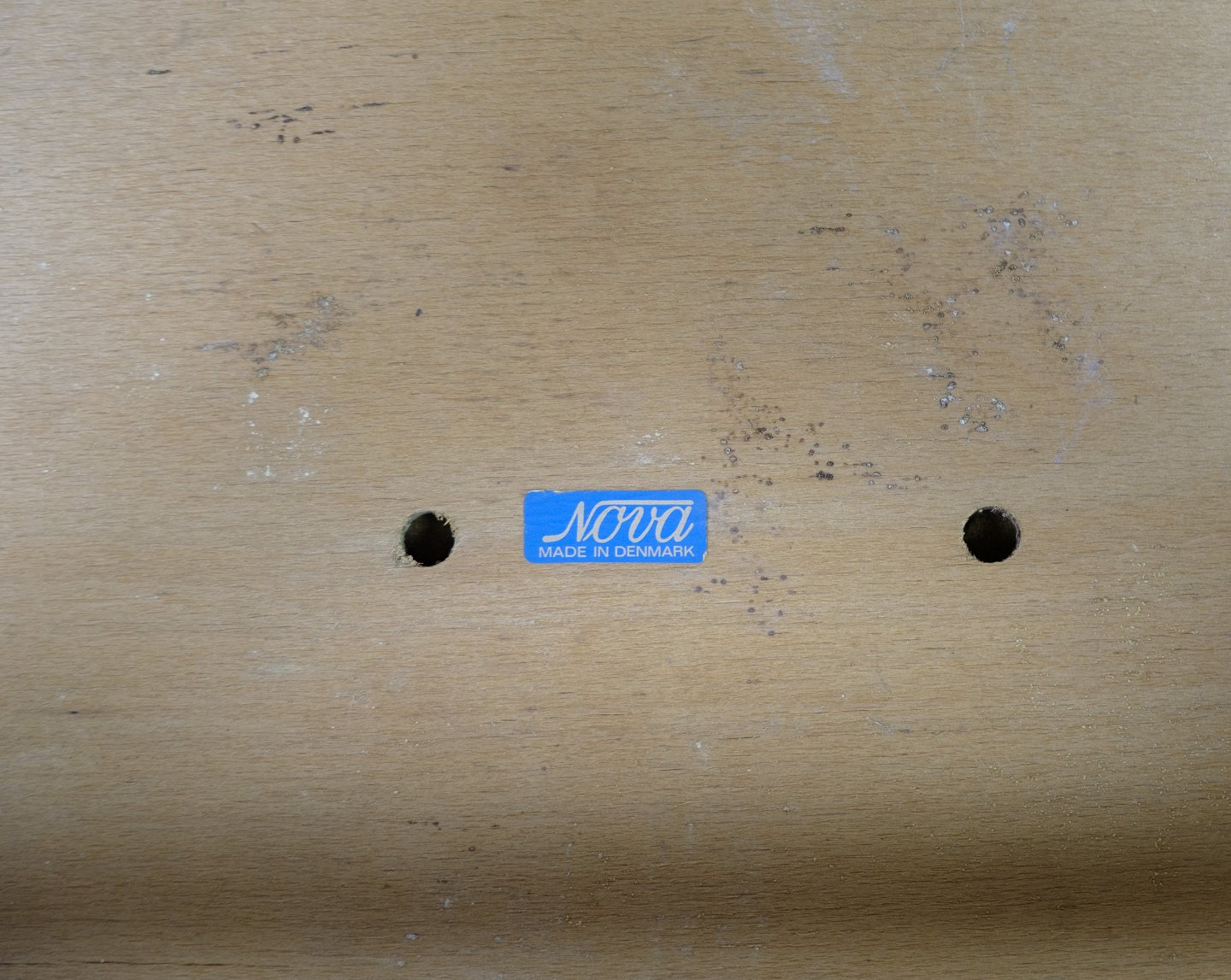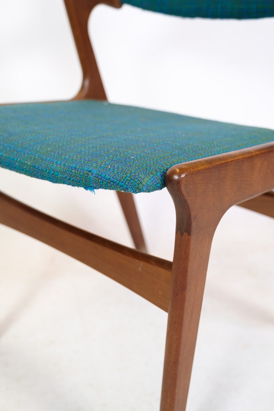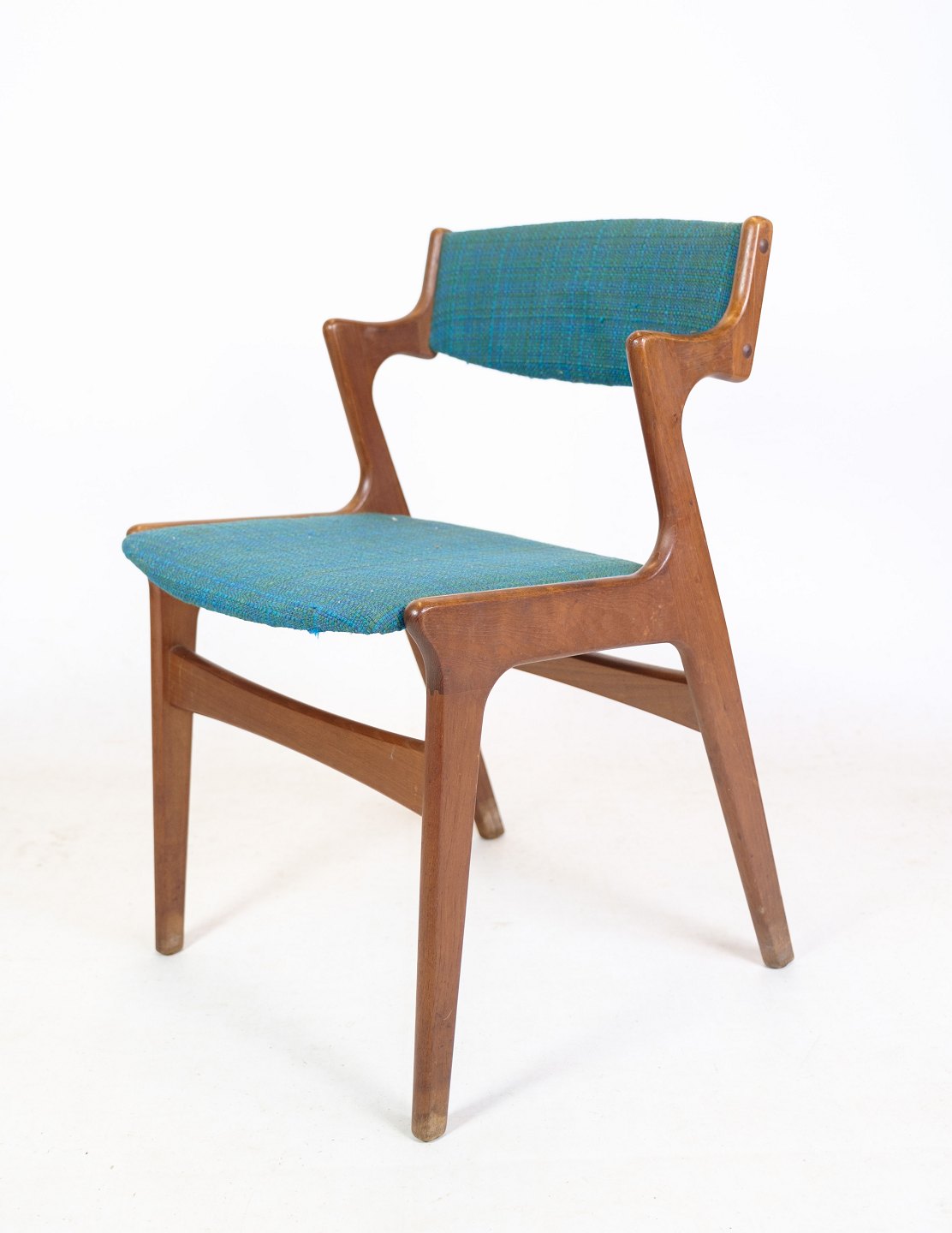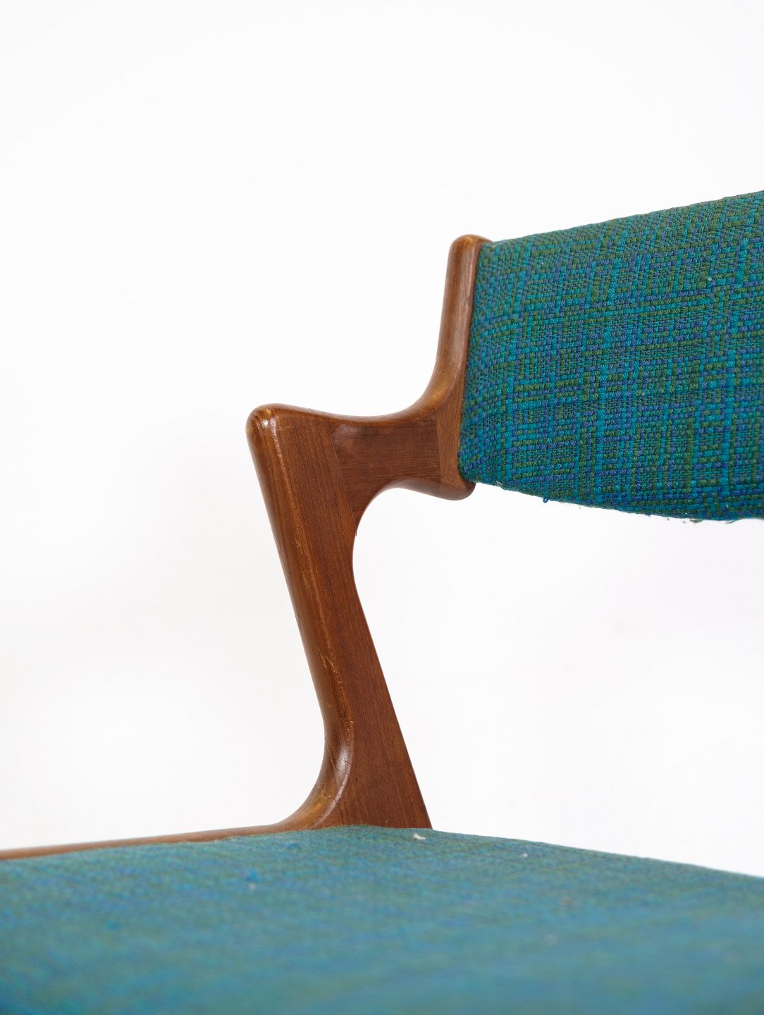 Sæt af fire spisestuestole i teak og lyseblåt stof af dansk design og fremstillet af Nova Møbelfabrik i 1960erne. Stolene er i flot brugt stand.