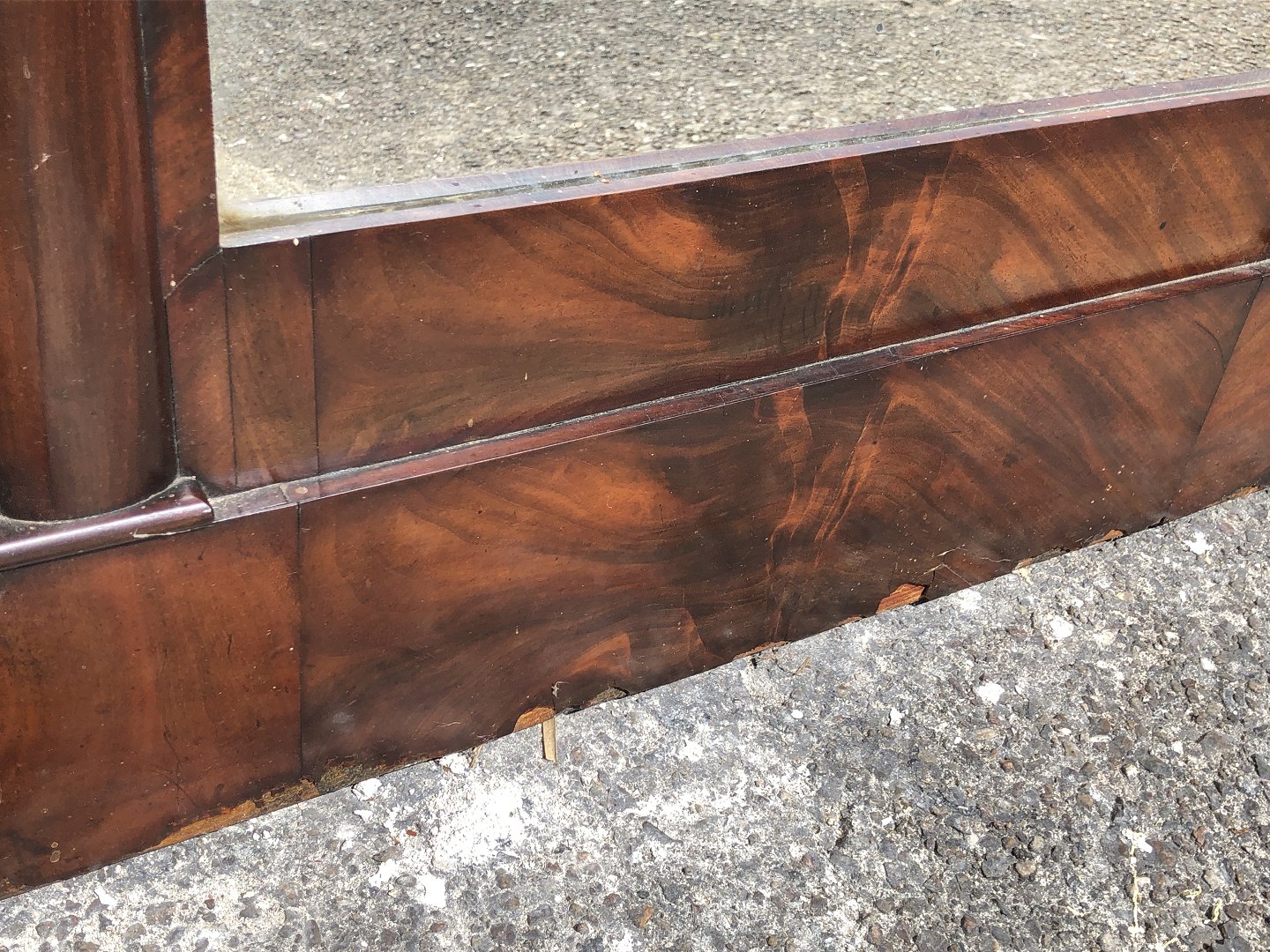 Large mirror in mahogany veneer. Some age-related signs of wear/veneer damage. (see photo) Dimensions: 178x74 cm