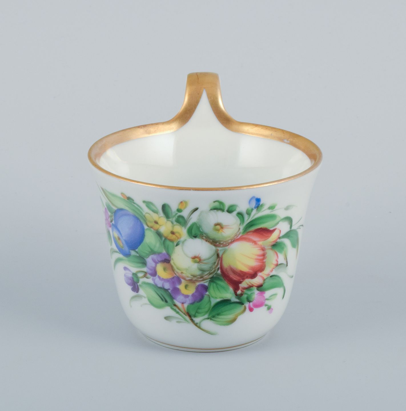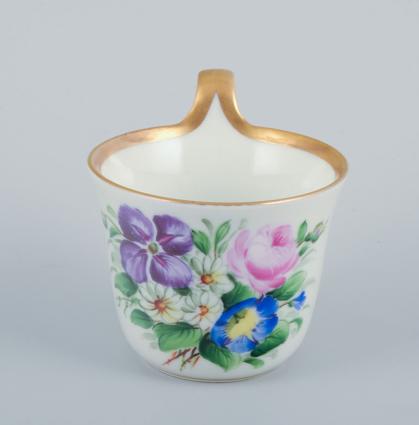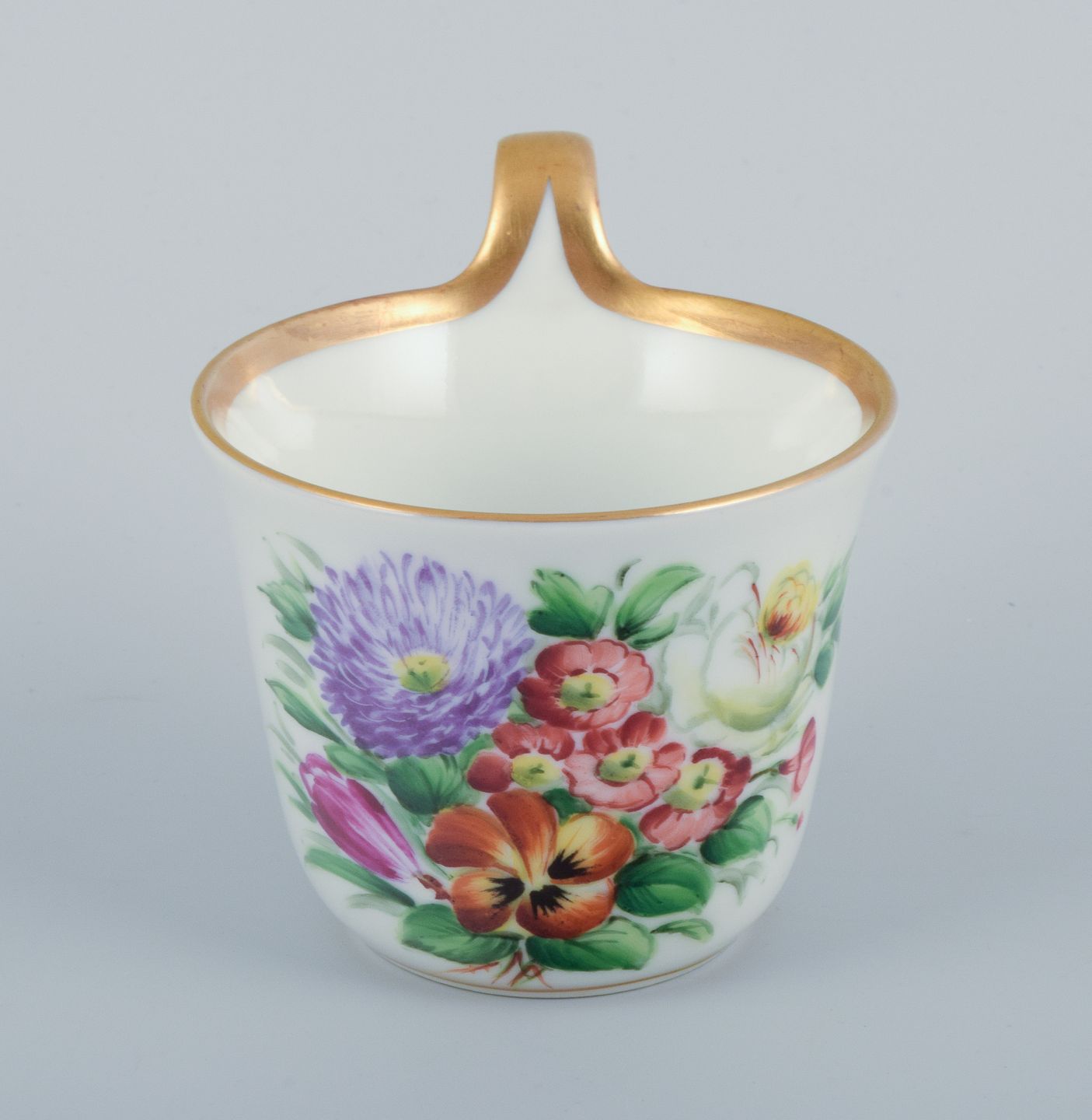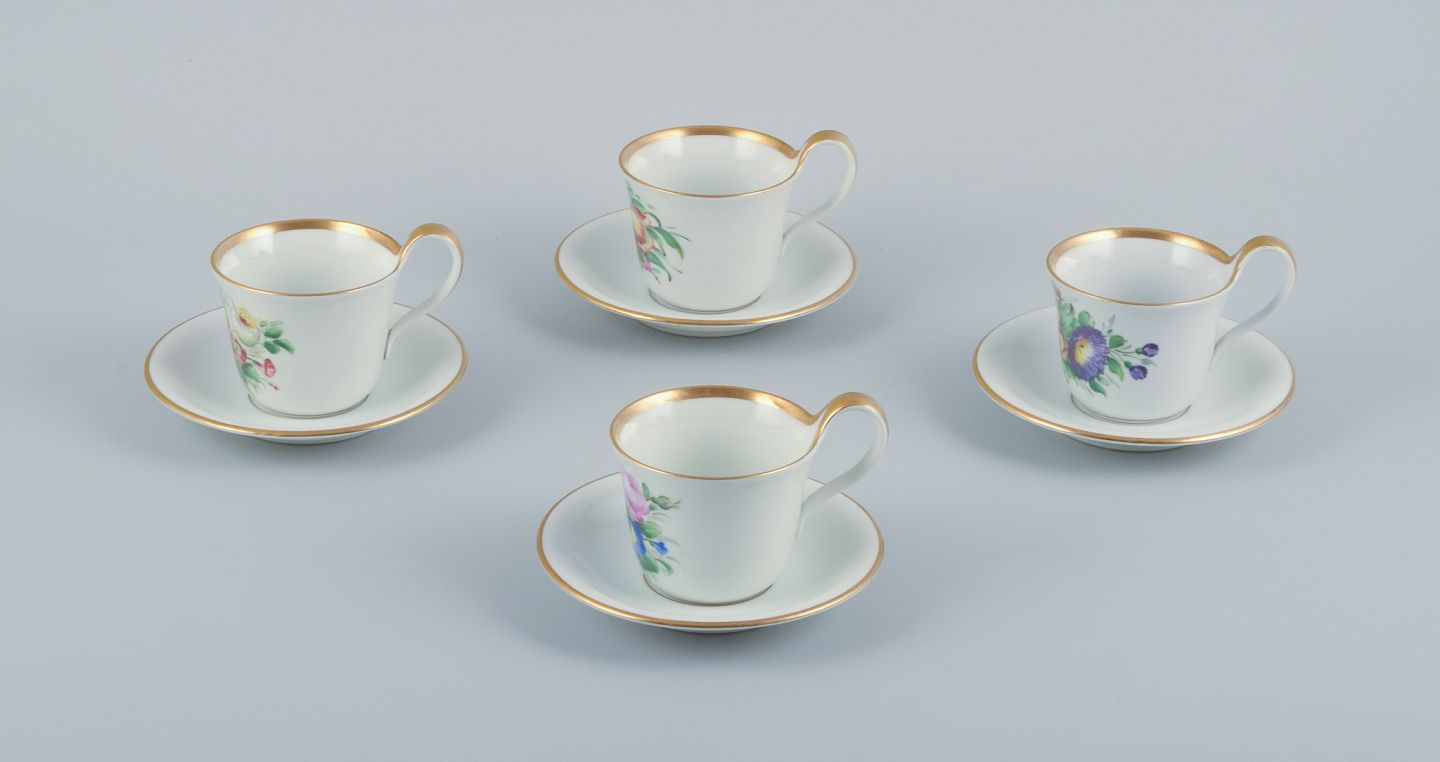 Bing & Grøndahl, a set of four antique coffee cups with high handles and saucers. Hand-painted with polychrome flower decoration. Porcelain of strong quality.