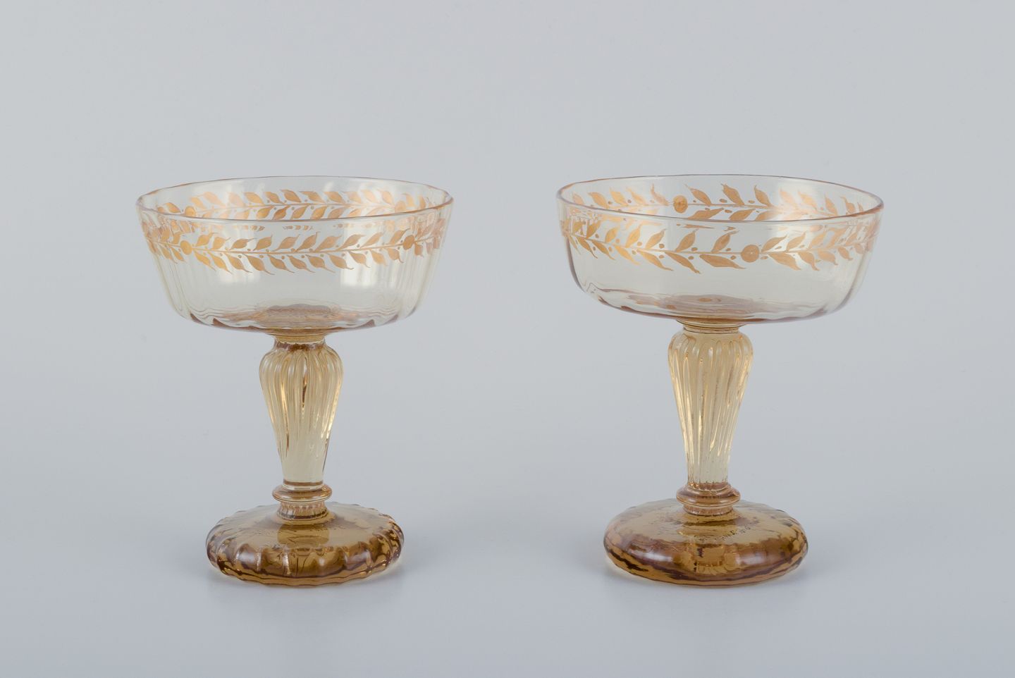 To champagneskåle i krystalglas hånddekoreret med blade i guld.