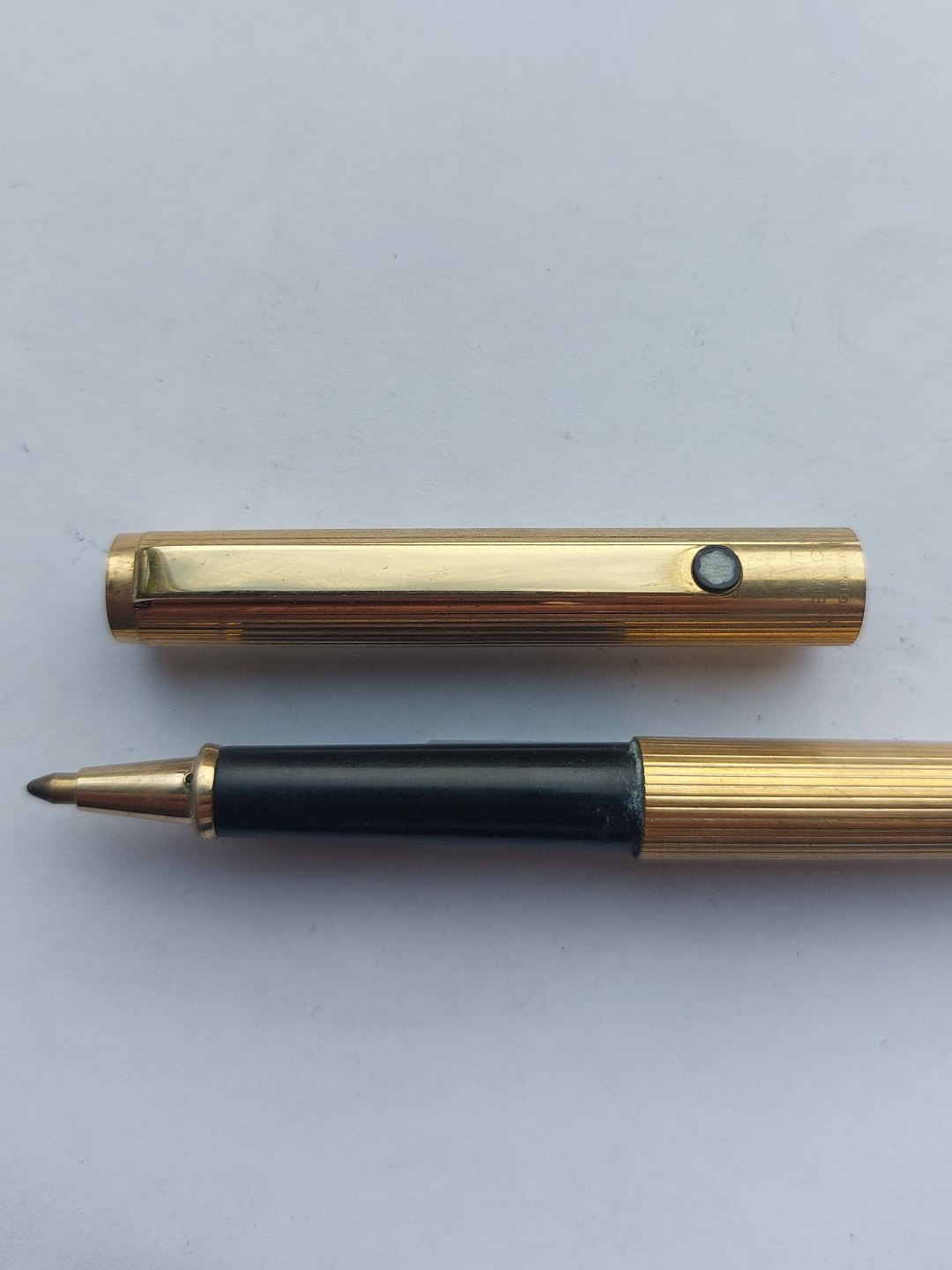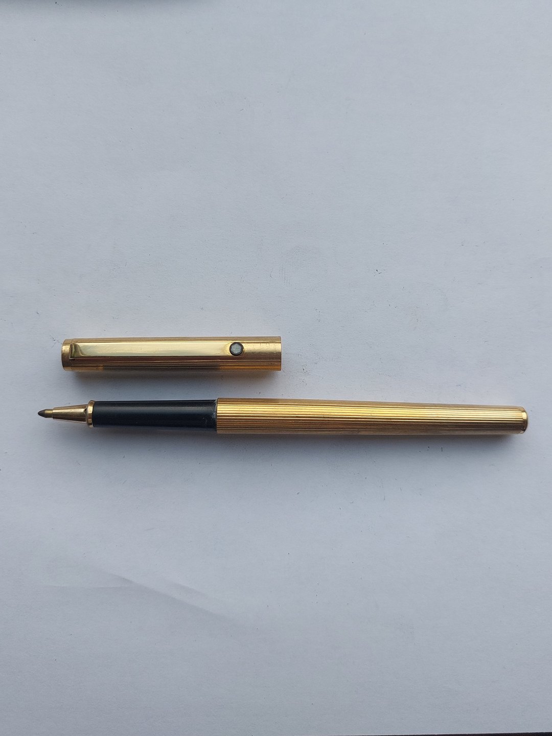 Slim Line eller S-line Montblanc kuglepen i guld double. Fremstillet i Tyskland. Fremstår i god stand uden skader eller reparationer. Den sorte refill, der sidder i virker - Indtil videre. Længde 14 cm.