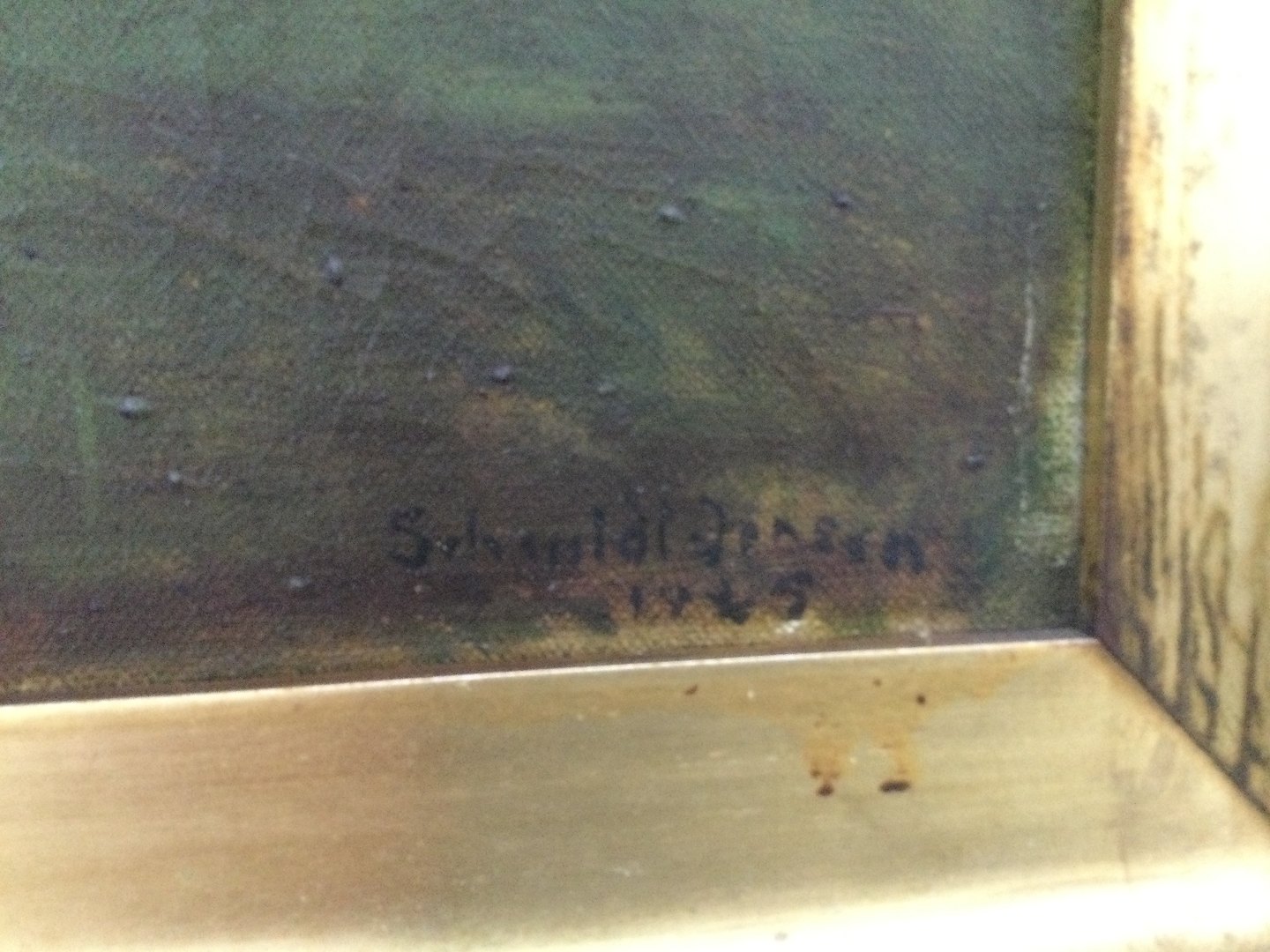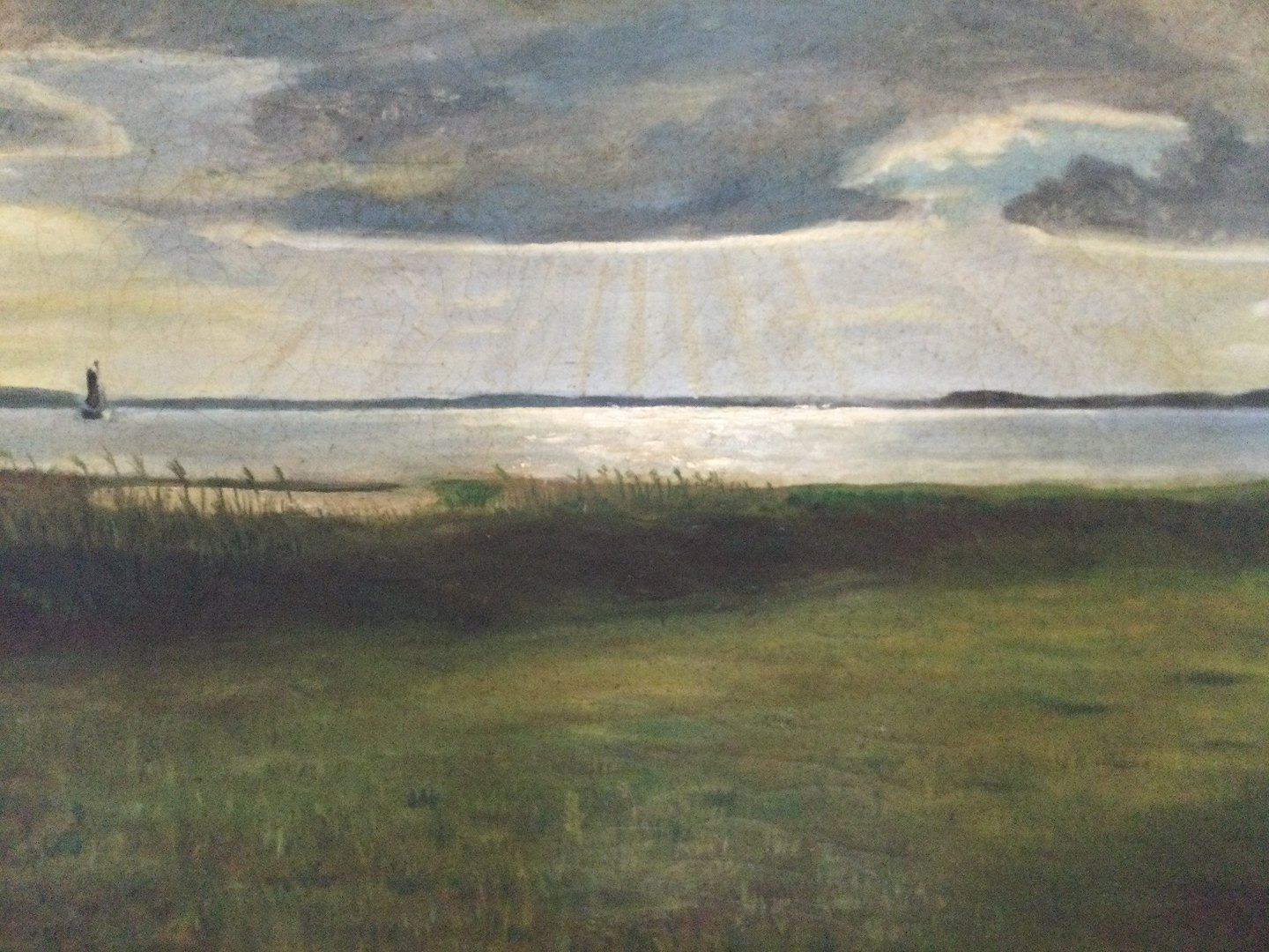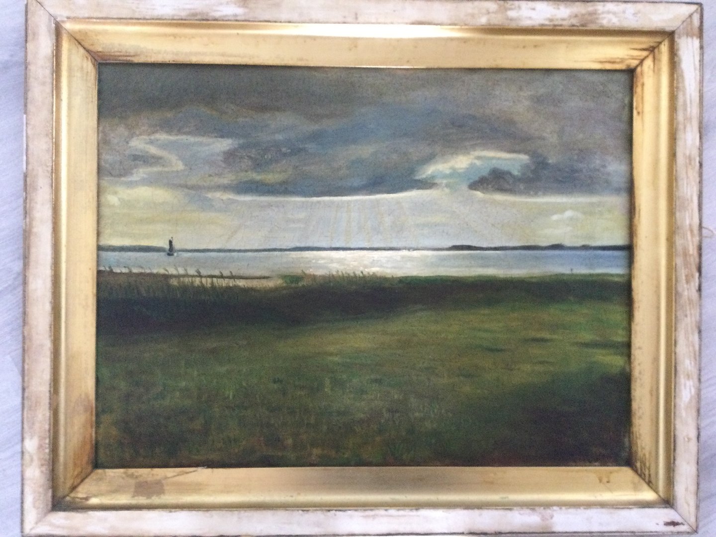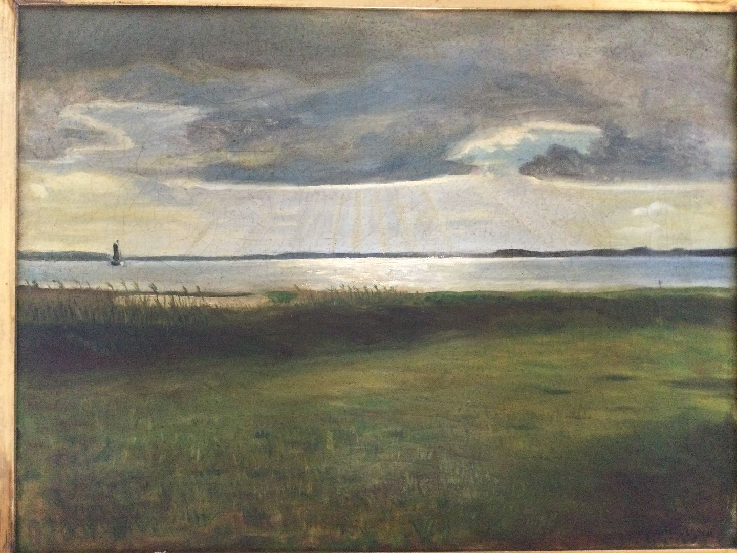 Maleri af Schmidt-Jensen - Solnedgang over sø med skib.