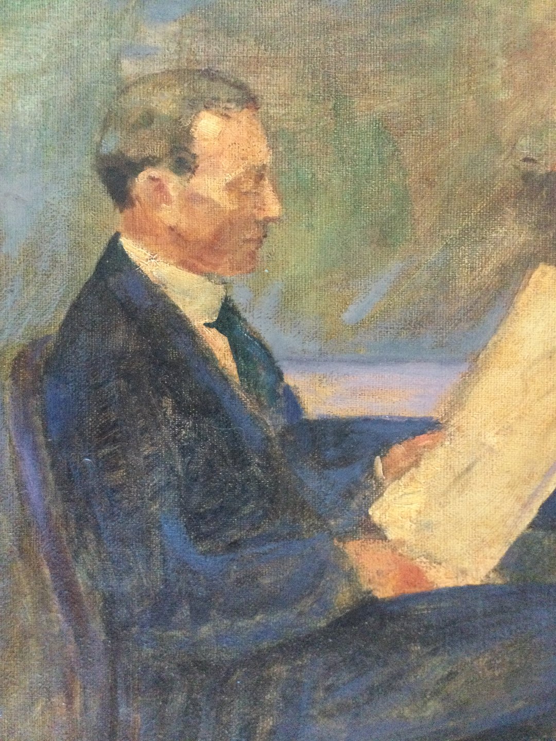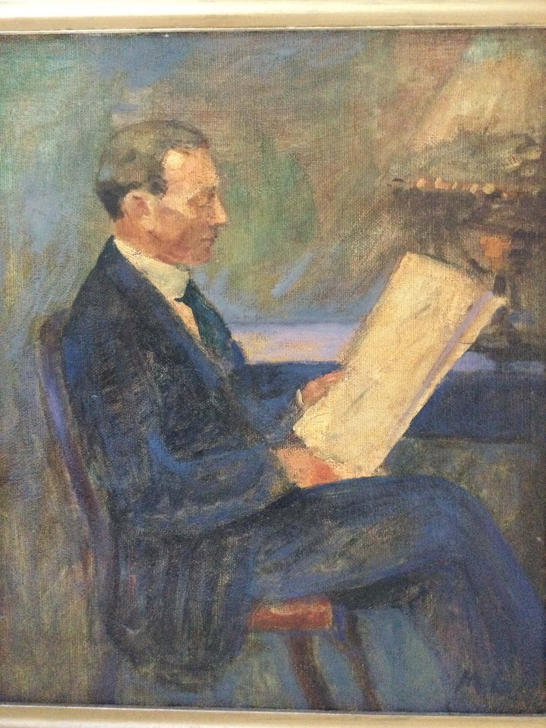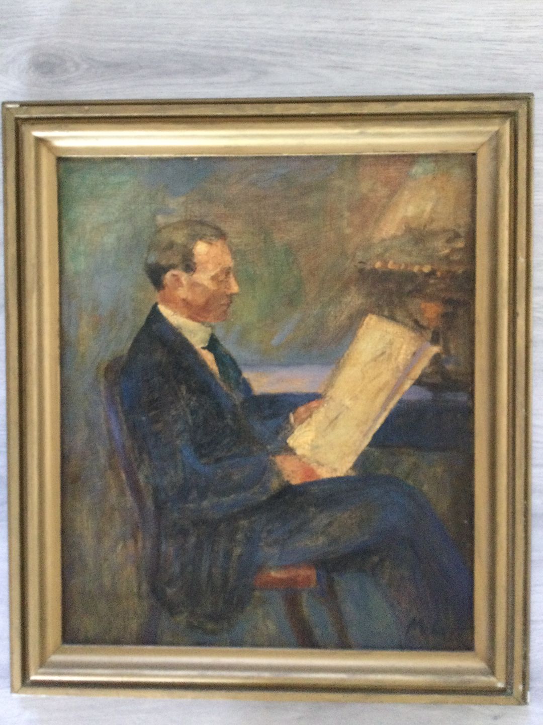 Maleri Mogens Gad - Siddende mand med avisen i interiør.