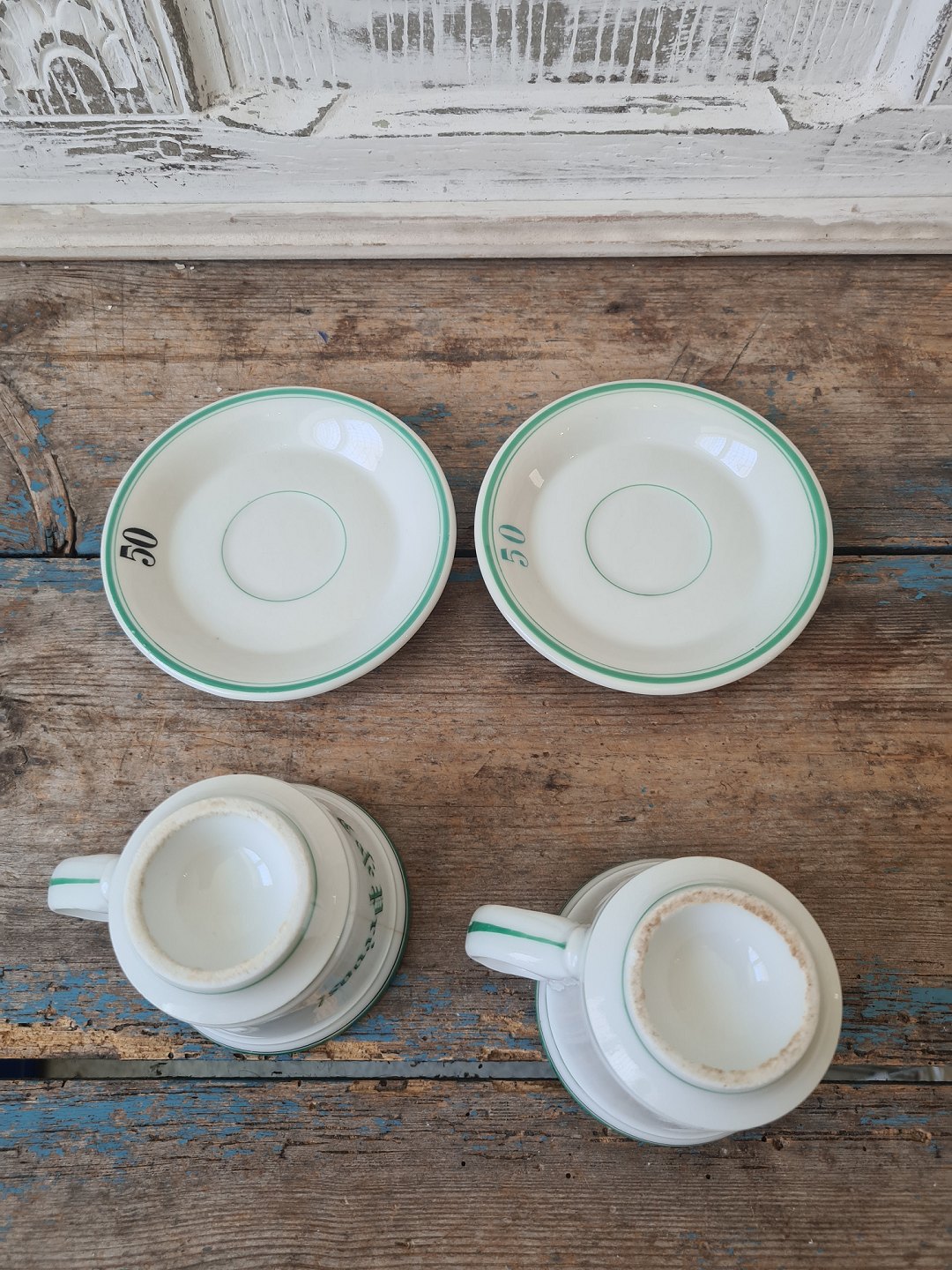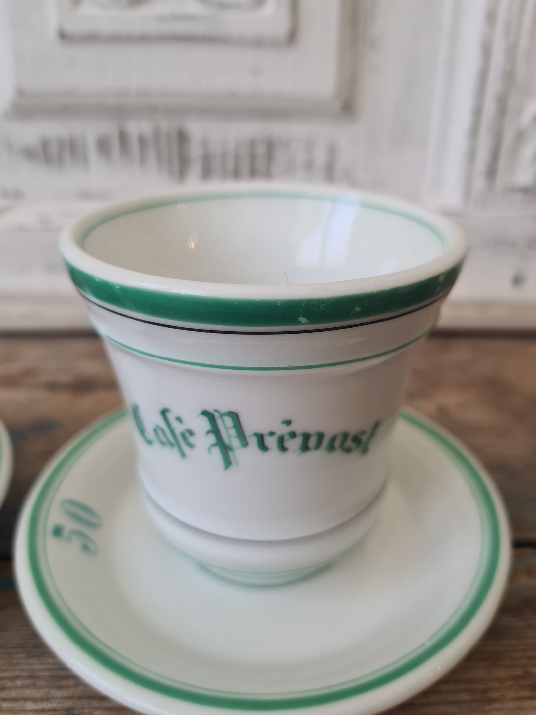 Pair of French café brűlot cups in strong iron porcelain decorated with green stripes and the text Café Prévost.
