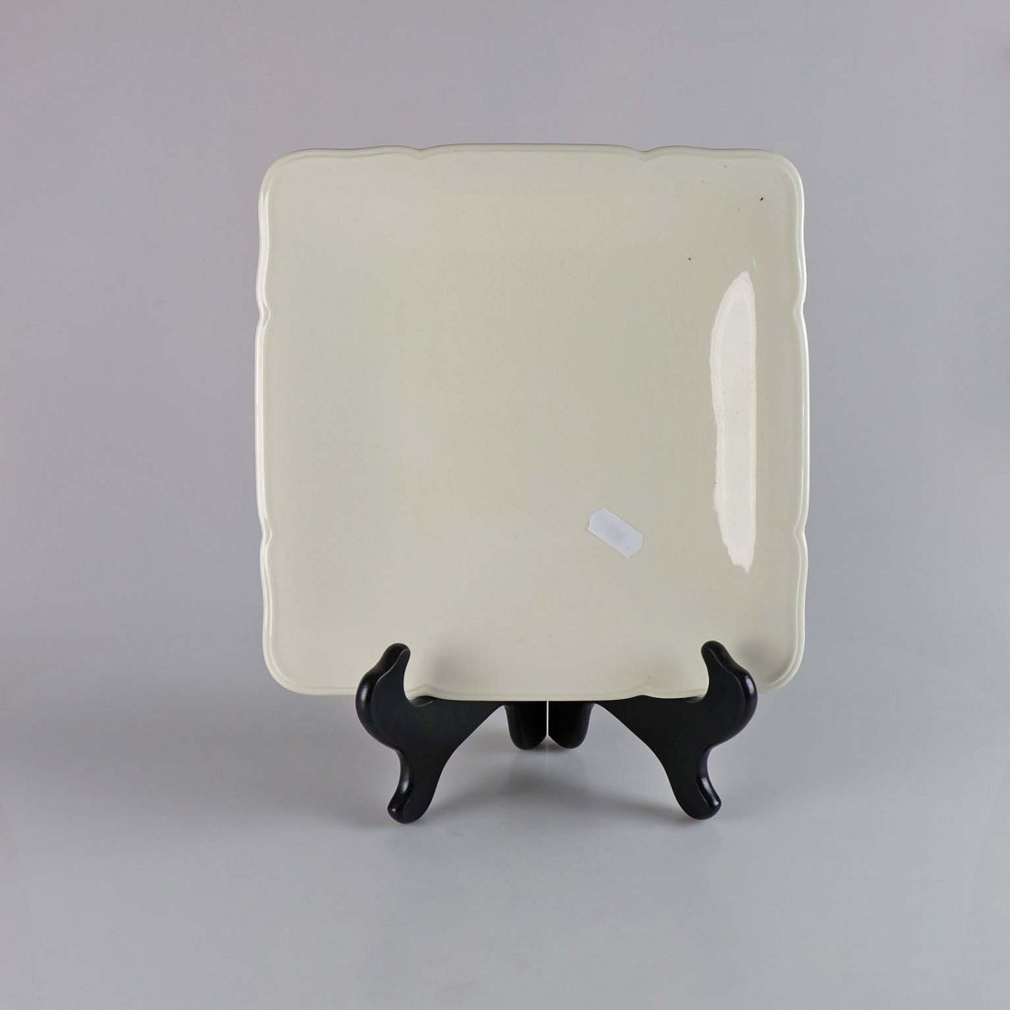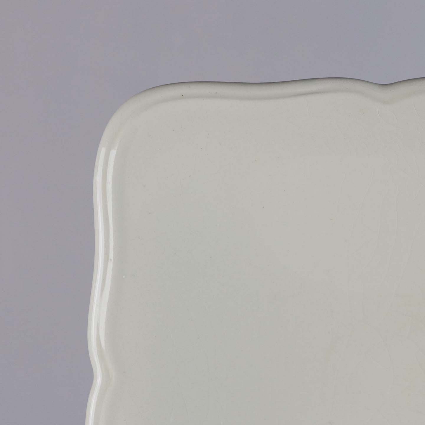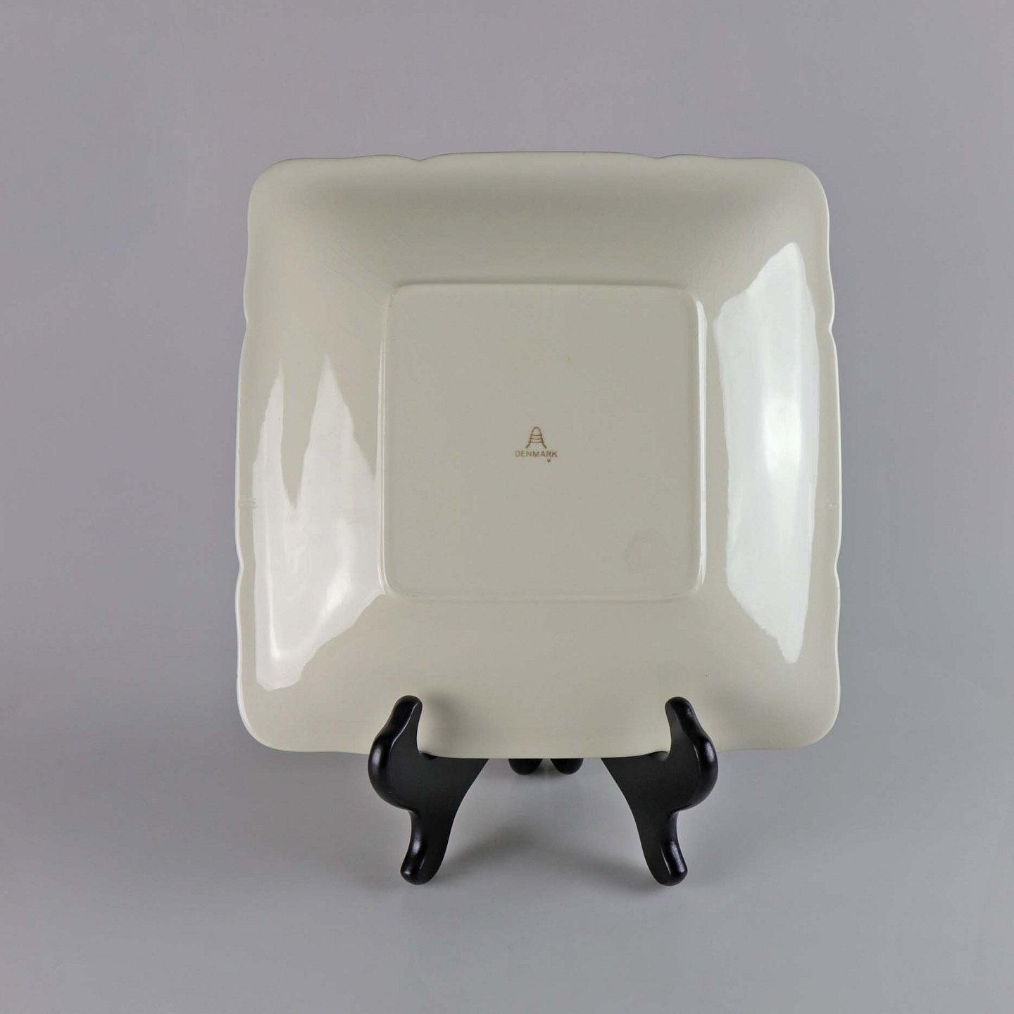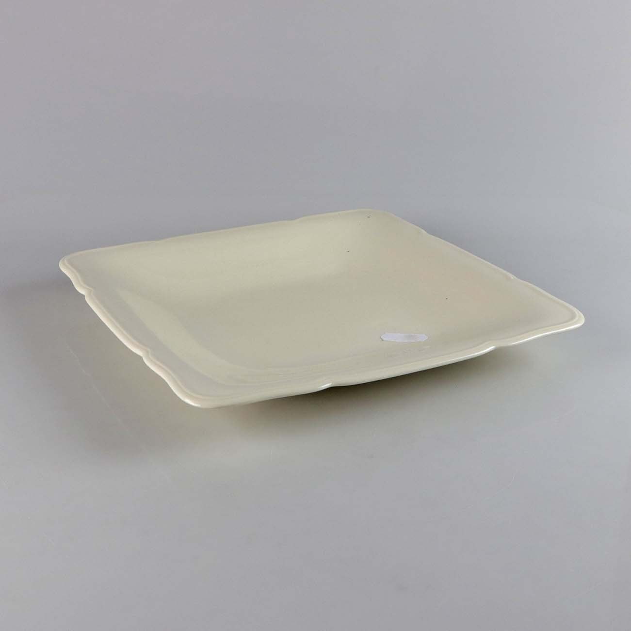 Kvadratisk, cremefarvet fad i fajance. I kanten er et lille bølge mønster til stellet Alma, sjældent set