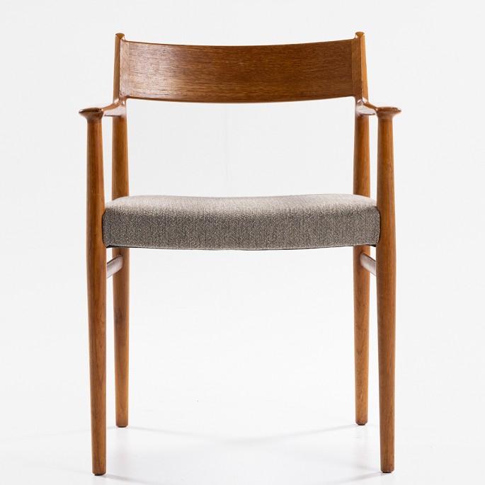 Armstol i teak og nybetrukket sæde i tekstil (Ecriture, farve 0270).