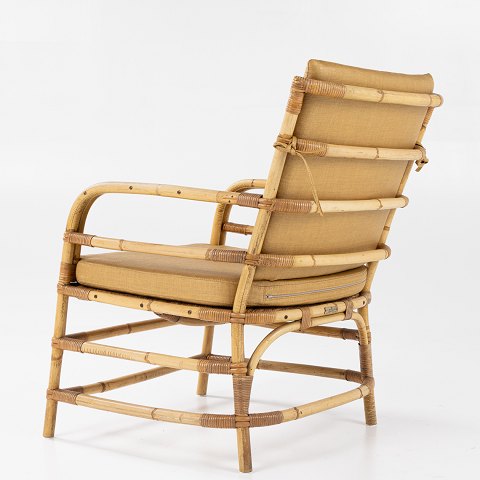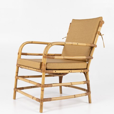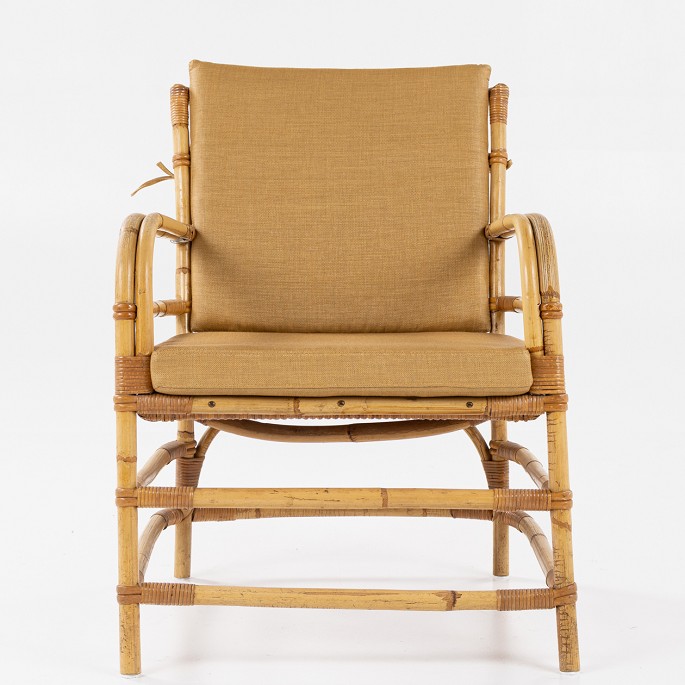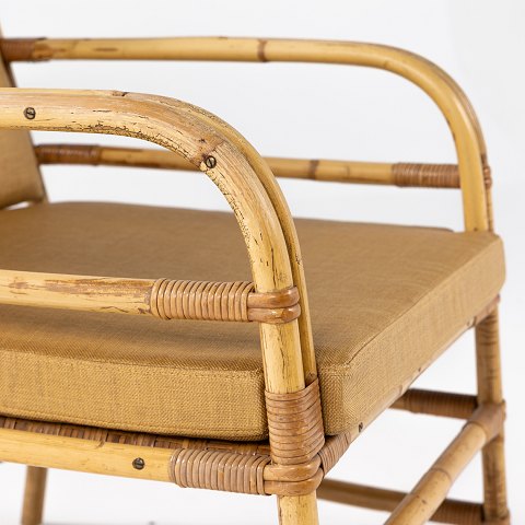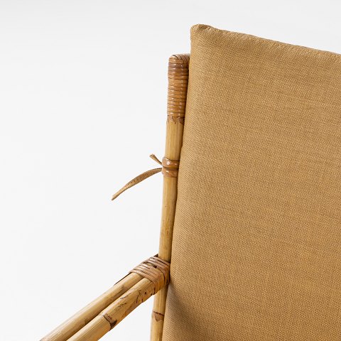 Kurvestol i flettet bambus med ny hynde i Marius (farve: Savane) fra Pierre Frey.