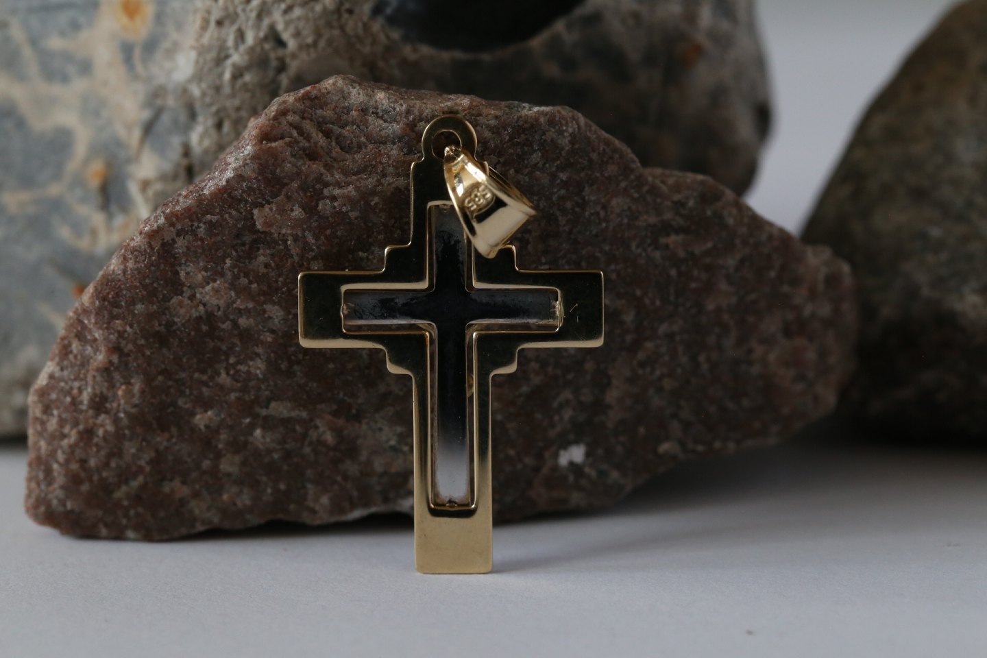 Smukt og detaljeret guldkors i 14 karat guld, lavet som dobbelt kors i rød- og hvidguld. De flotte farvespil, samt detaljen med Kristus på korset, gør dette vedhæng særligt specielt. Det er diskret, men samtidig flot når det hænger i en guldkæde om halsen. Ideel gaveide til konfirmation eller barnedåb.