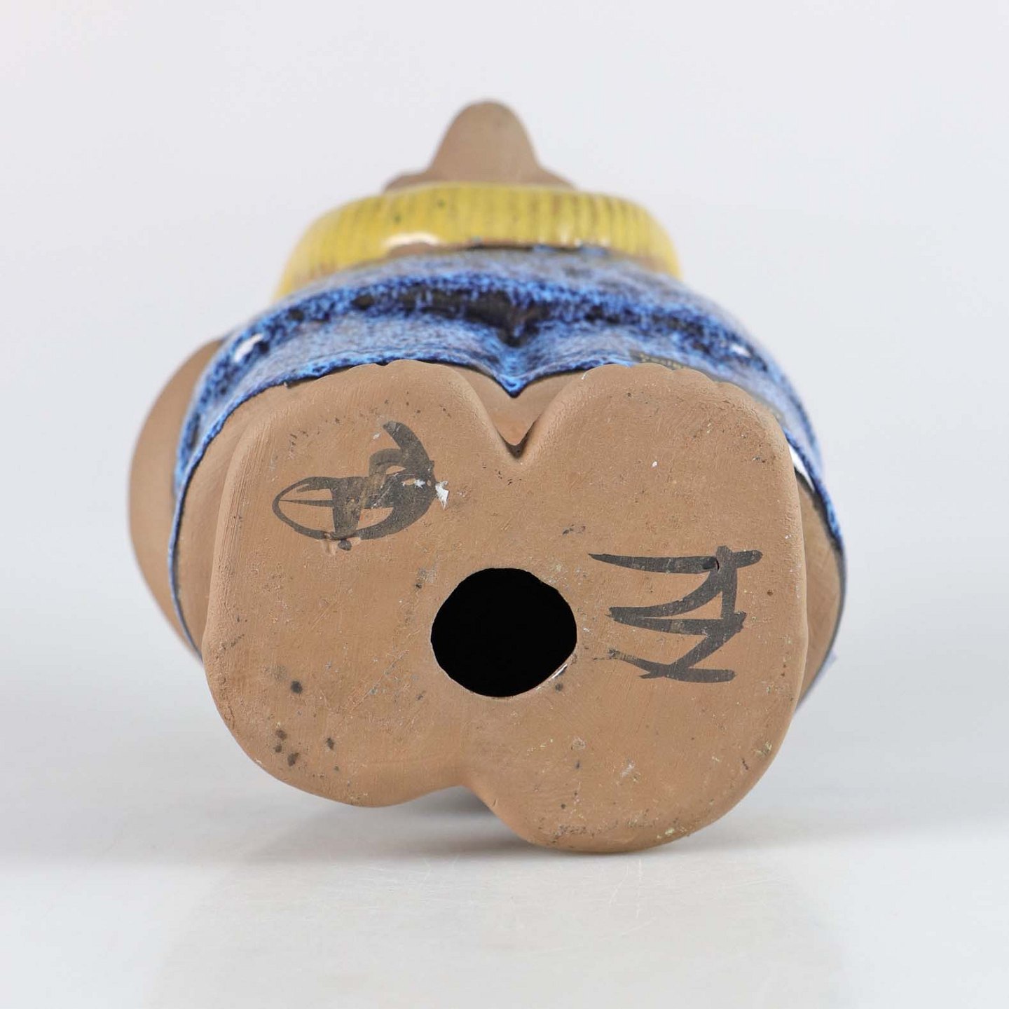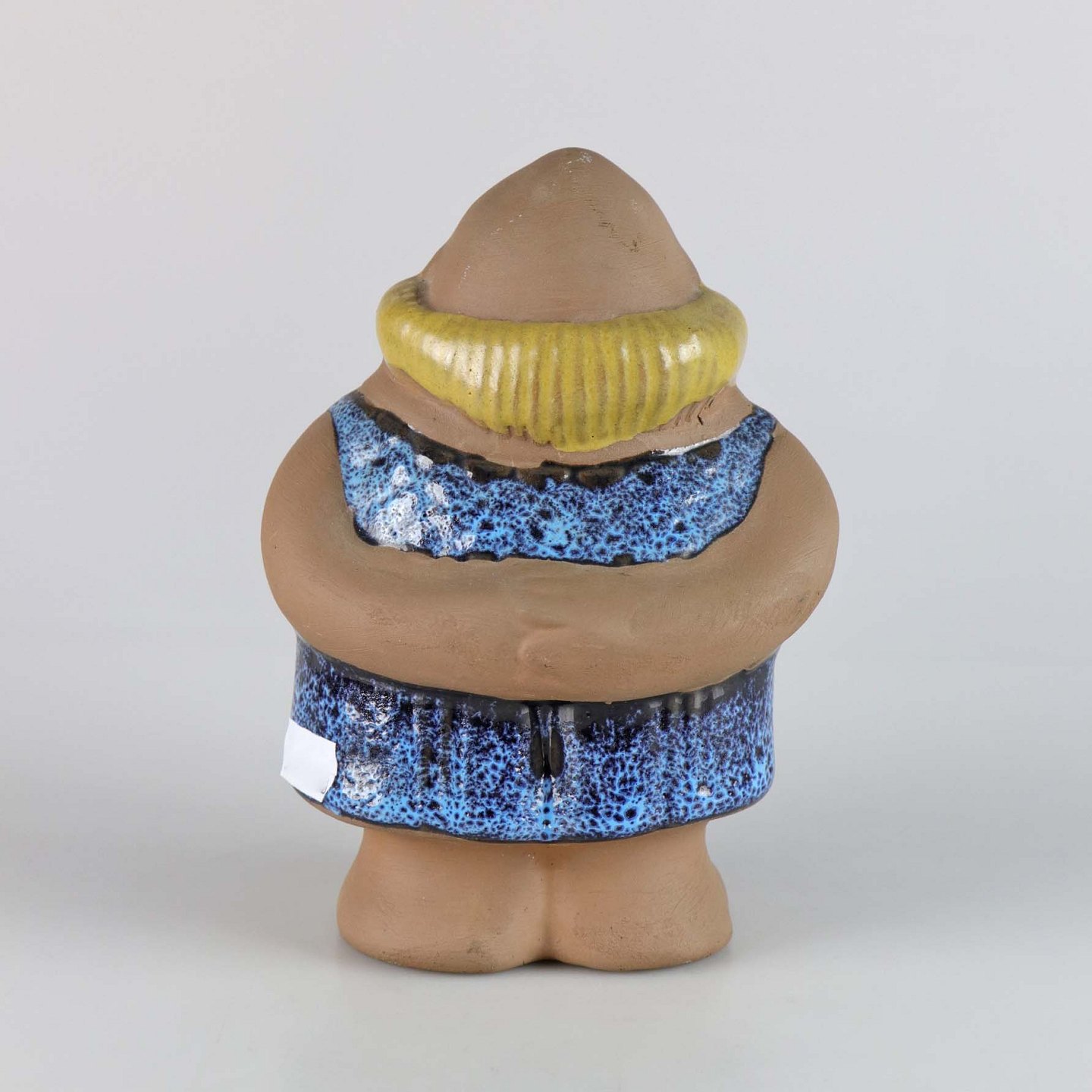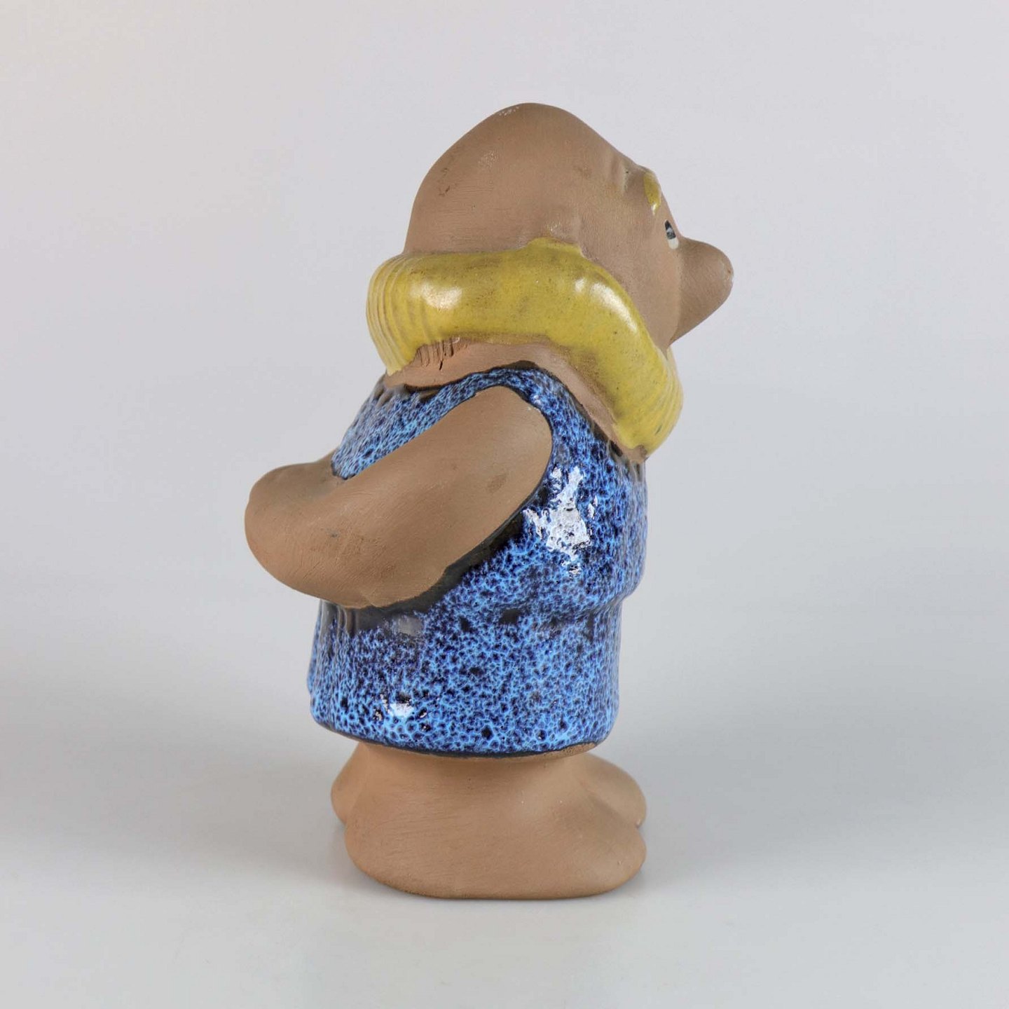 Figur af keramik, udformet som en skaldet mand med skæg og blåt tøj