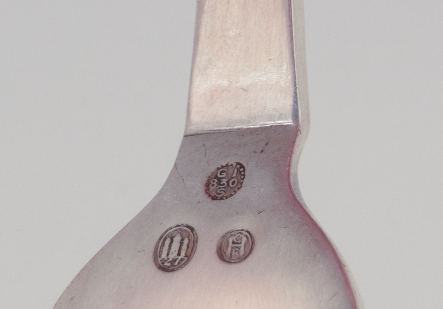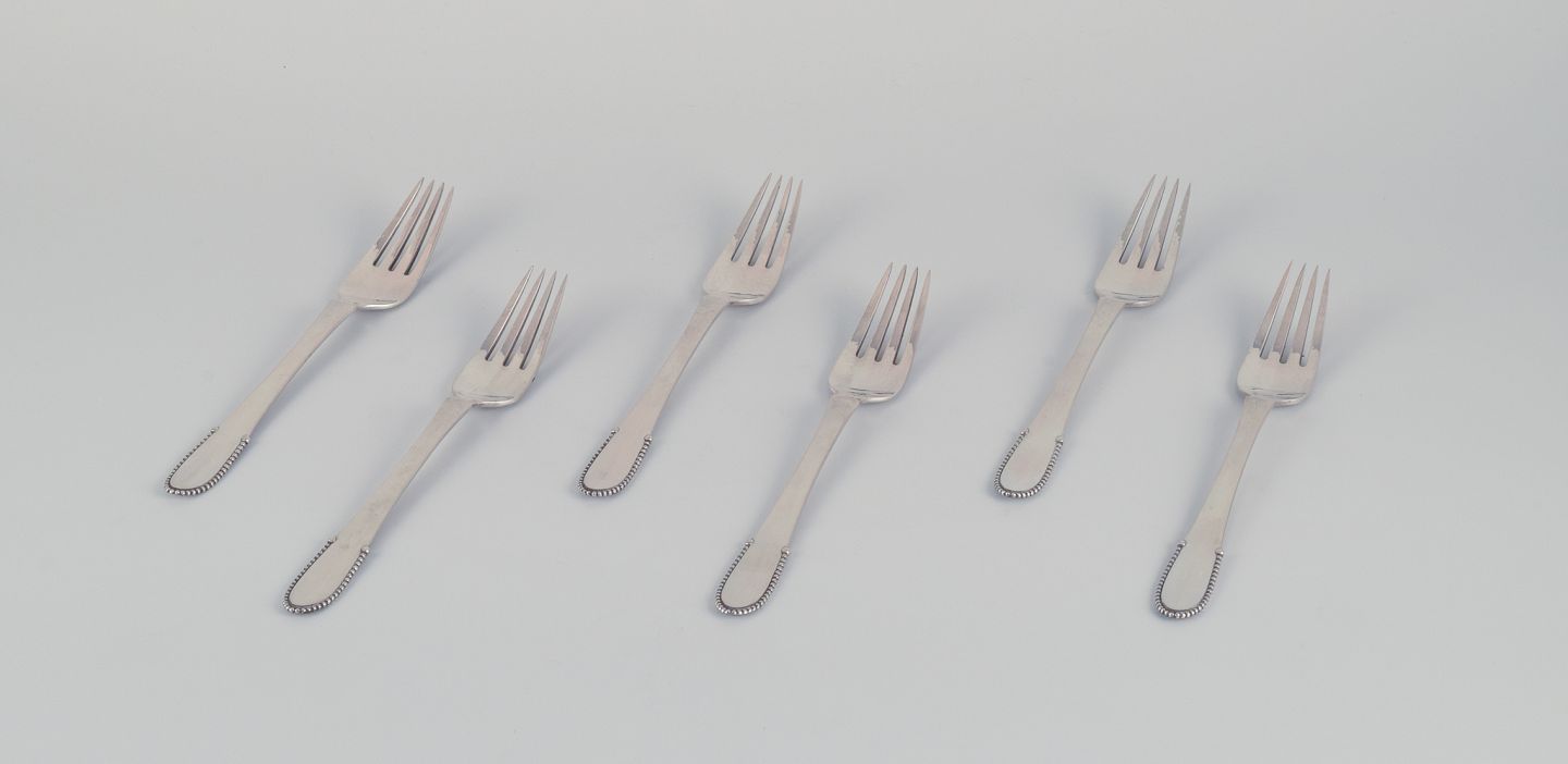 Georg Jensen, et sæt på seks Kugle middagsgafler i tretårnet sølv.