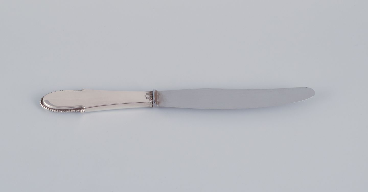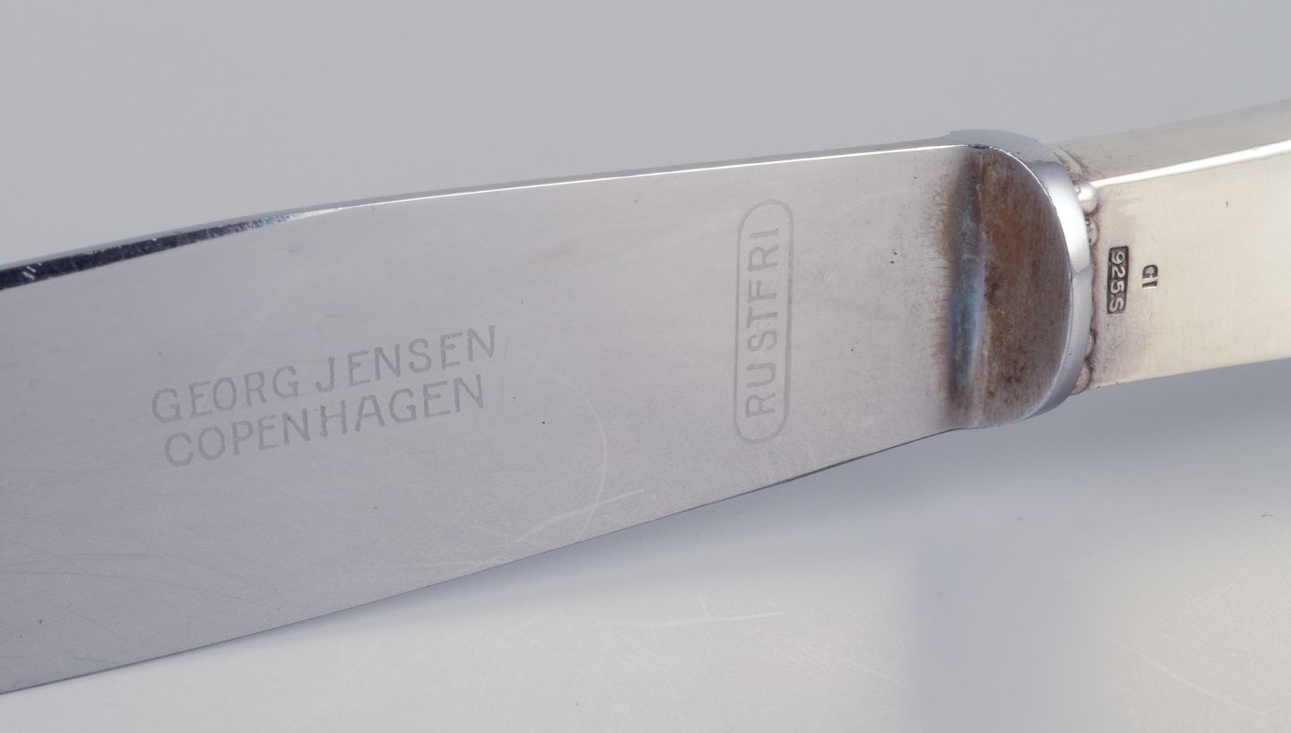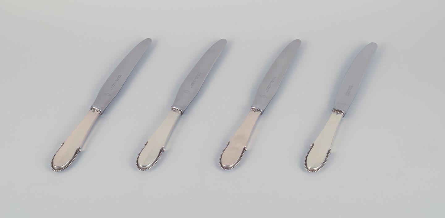 Georg Jensen, et sæt på fire Kugle middagsknive med kort skaft i tretårnet sølv med blad i rustfrit stål.