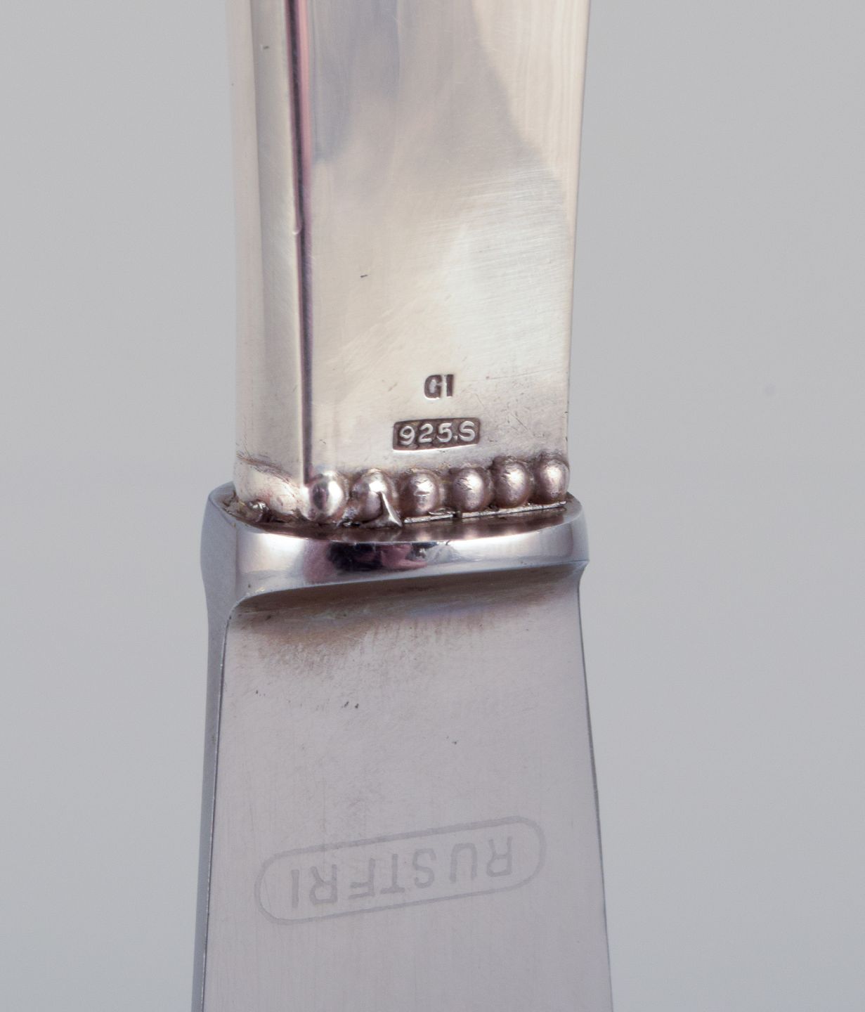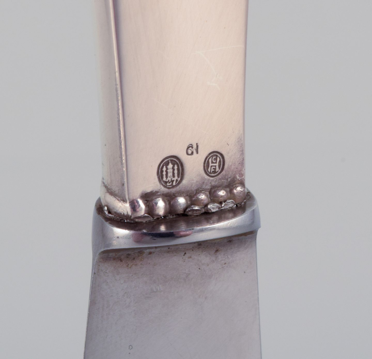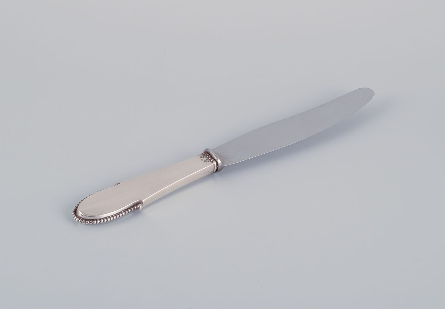 Georg Jensen, et sæt på fire Kugle middagsknive med kort skaft i tretårnet sølv med blad i rustfrit stål.