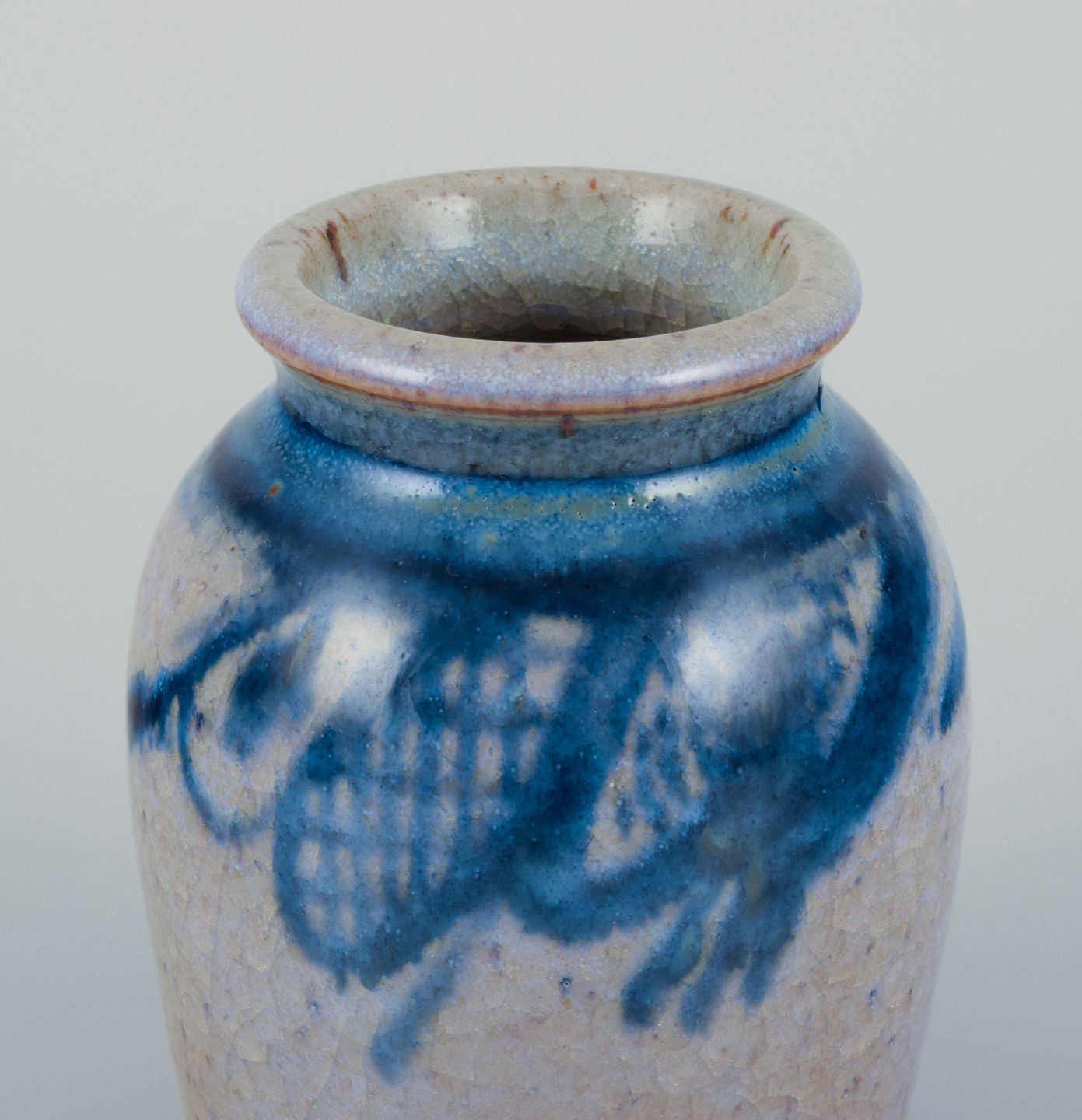 Den ene vase med glansfuld glasur i blålige og violette toner.