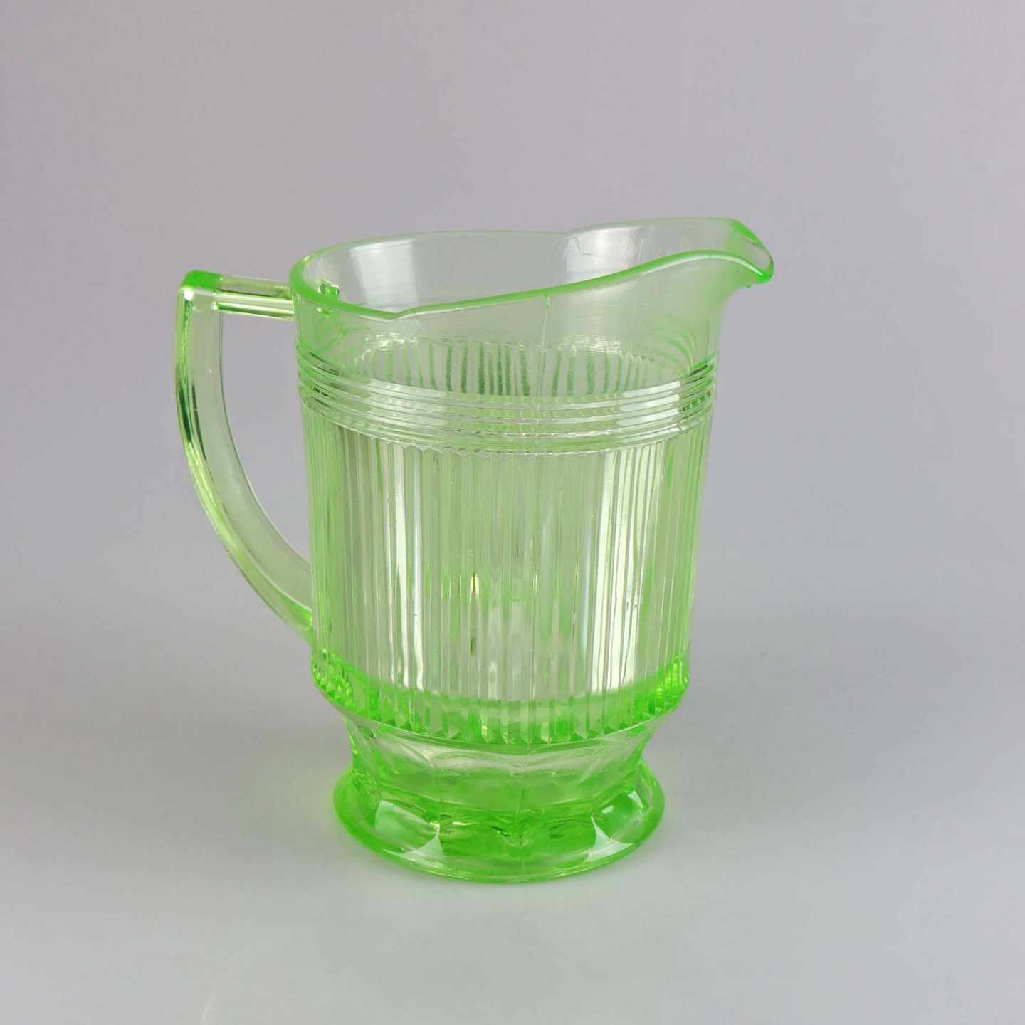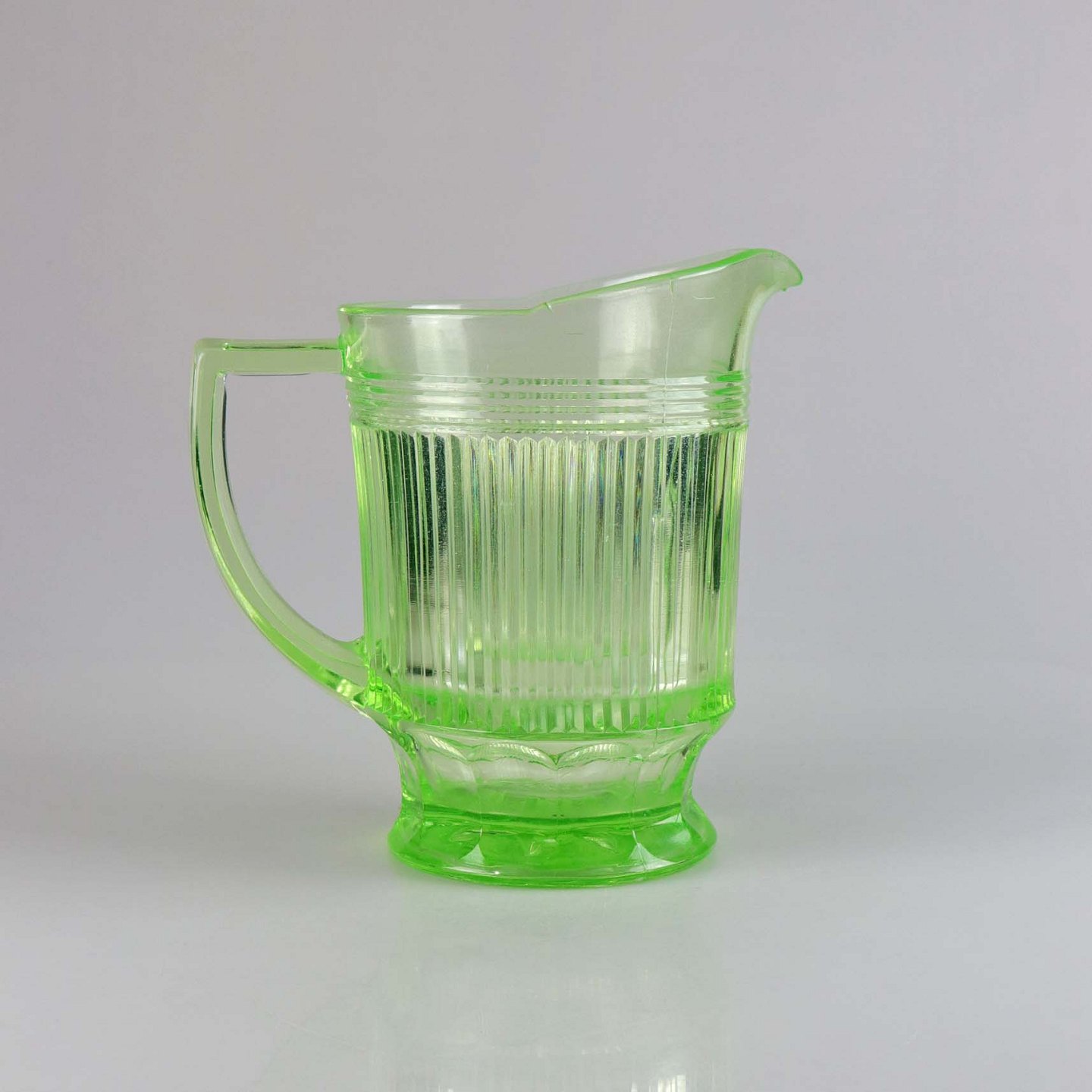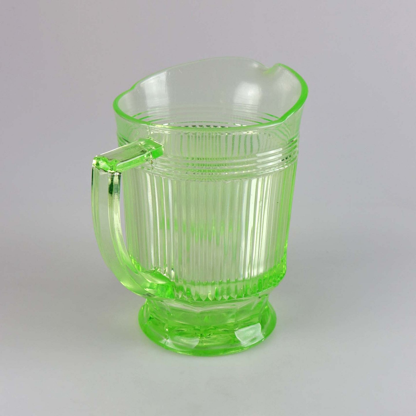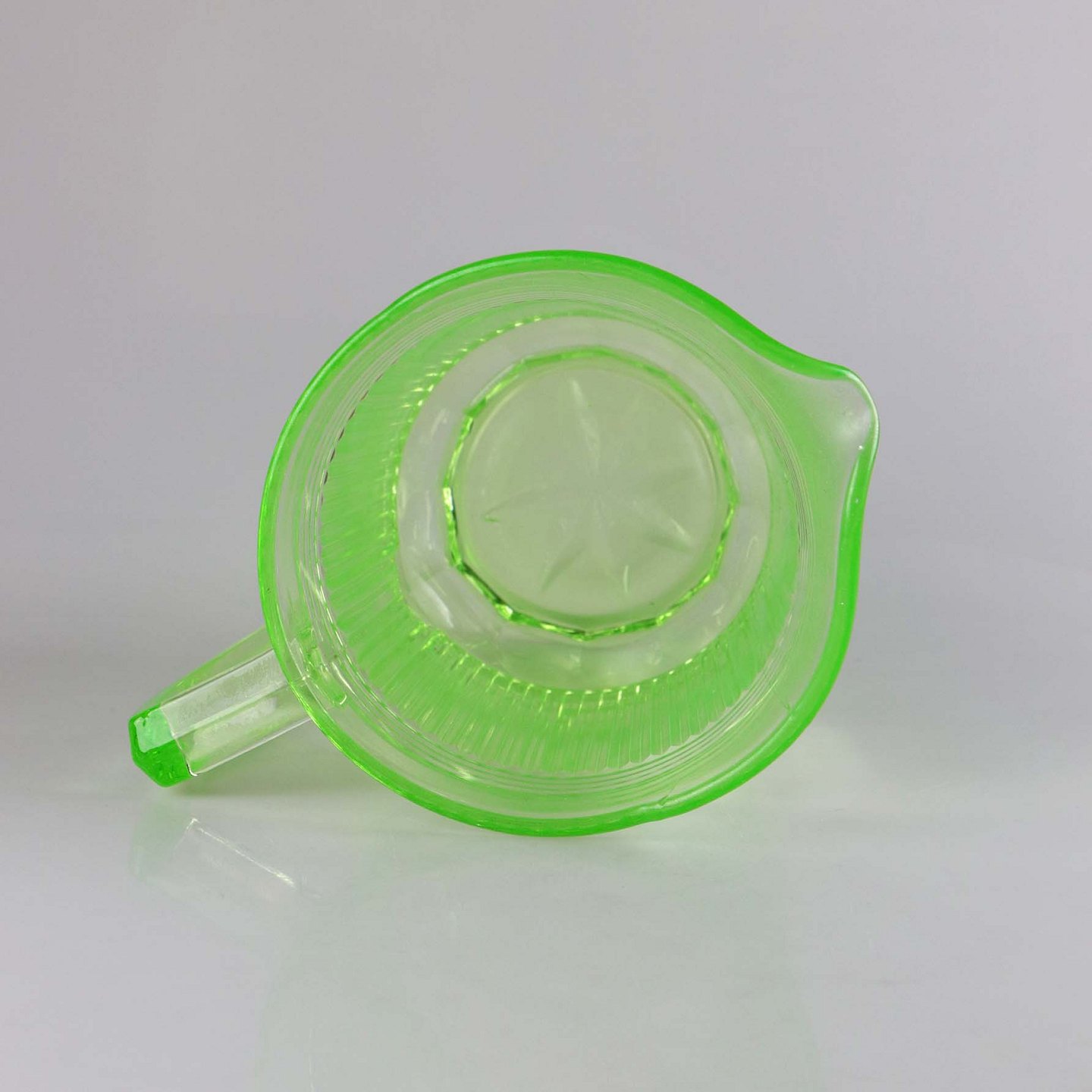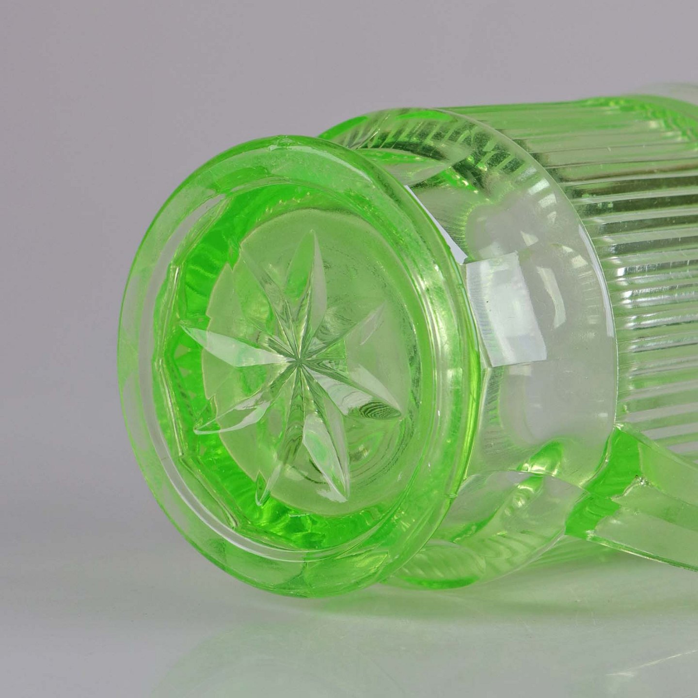Kande af uranfarvet glas. Med efterligninger af skær slibning og facetter, men udført som presset glas.