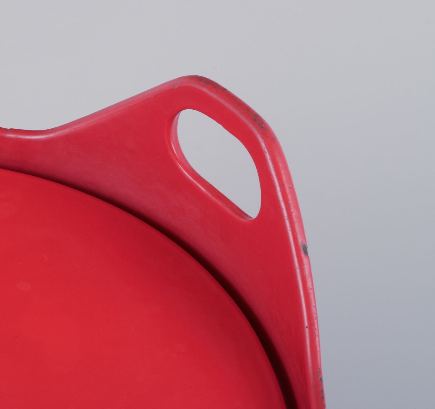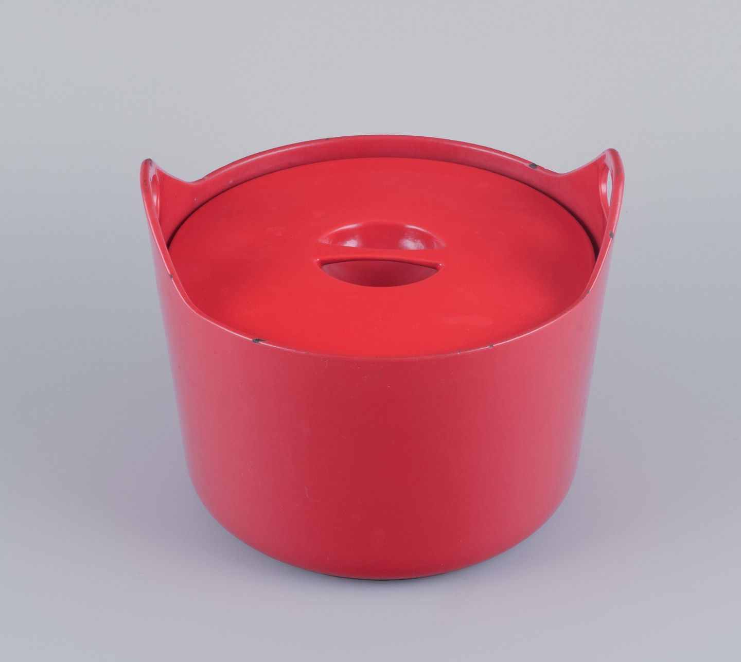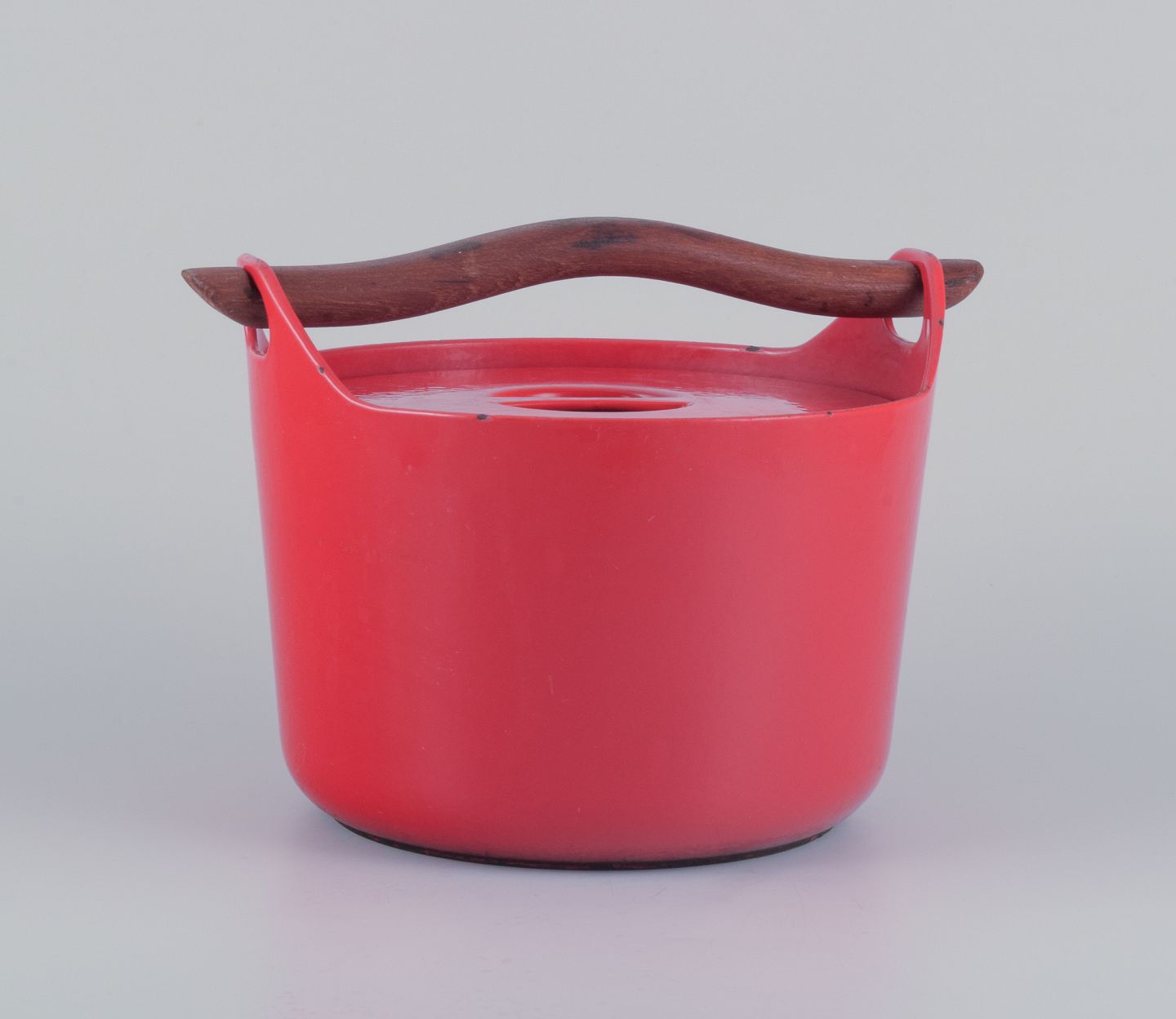 Timo Sarpaneva for Rosenlew, Finland, støbejernsgryde i rød emalje med træskaft.