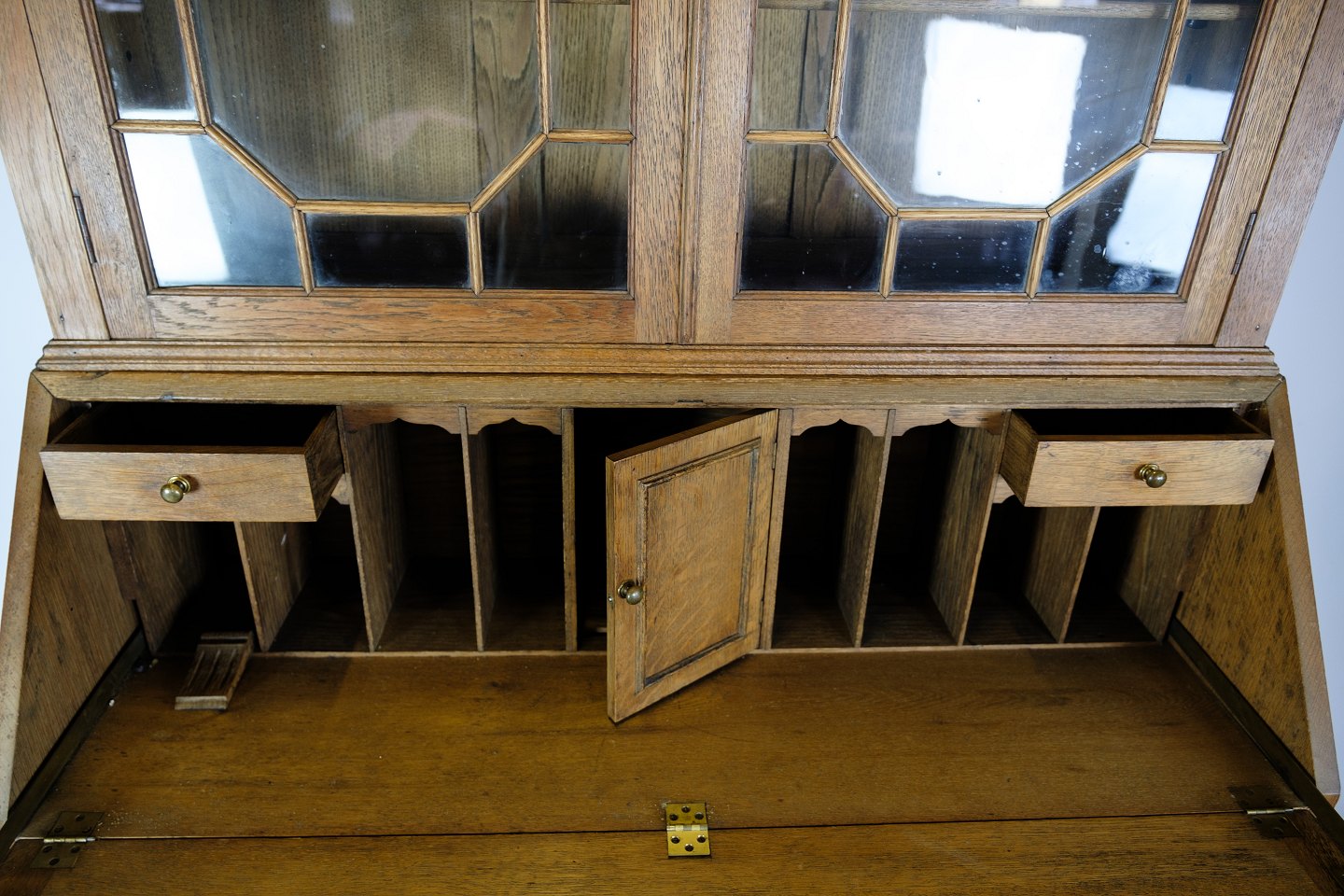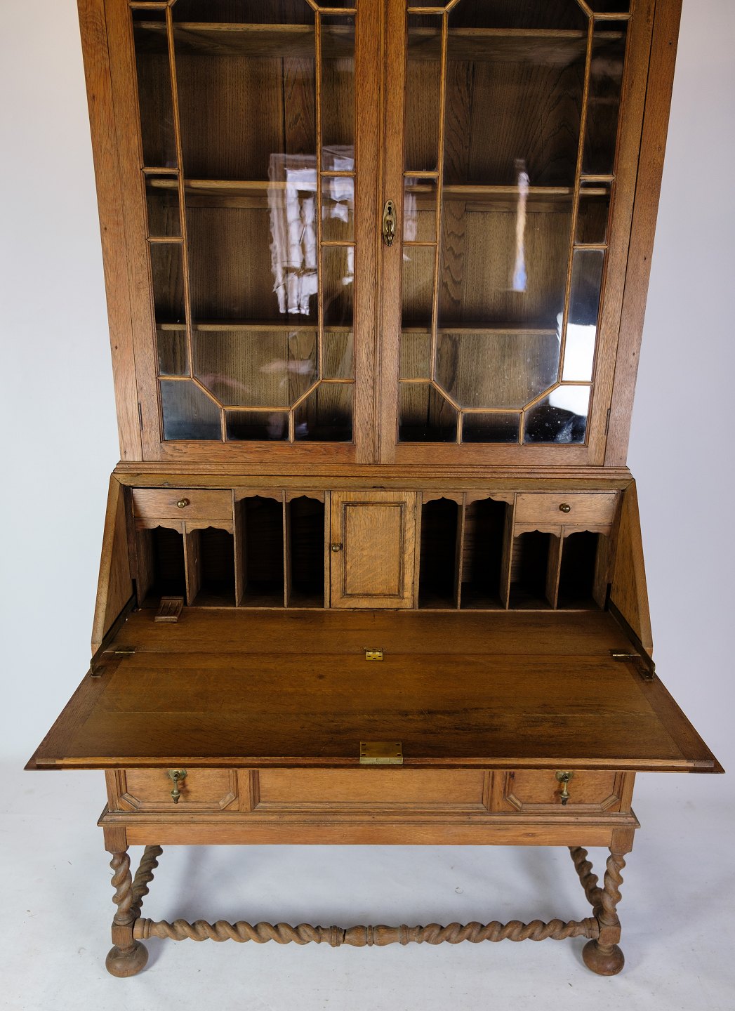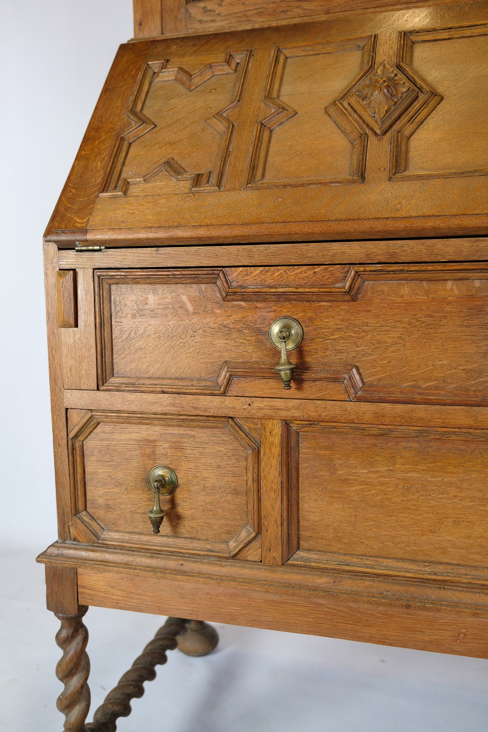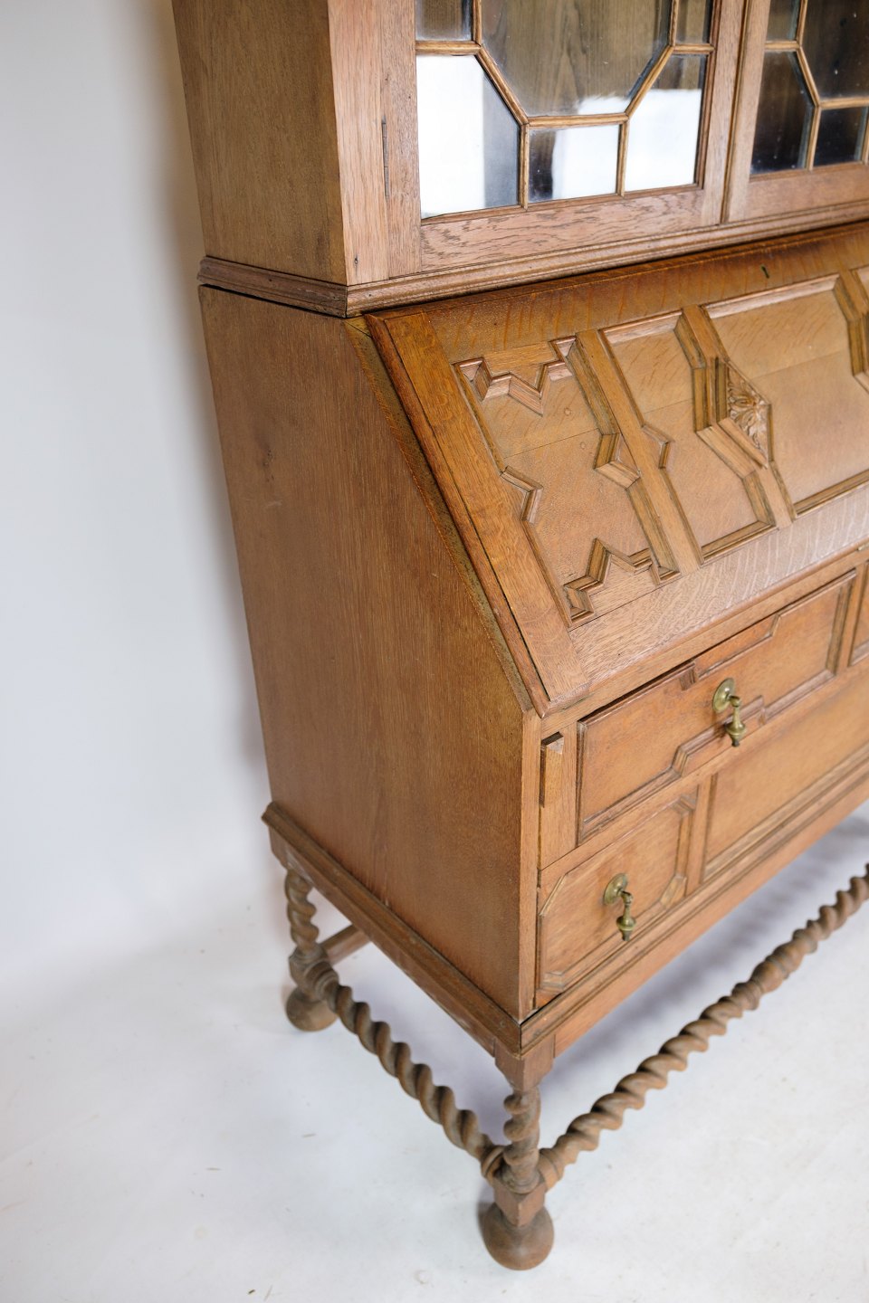Chatol with upper cabinet in oak and glass doors and bars decorated with wood carvings originally from England, 1890s.
