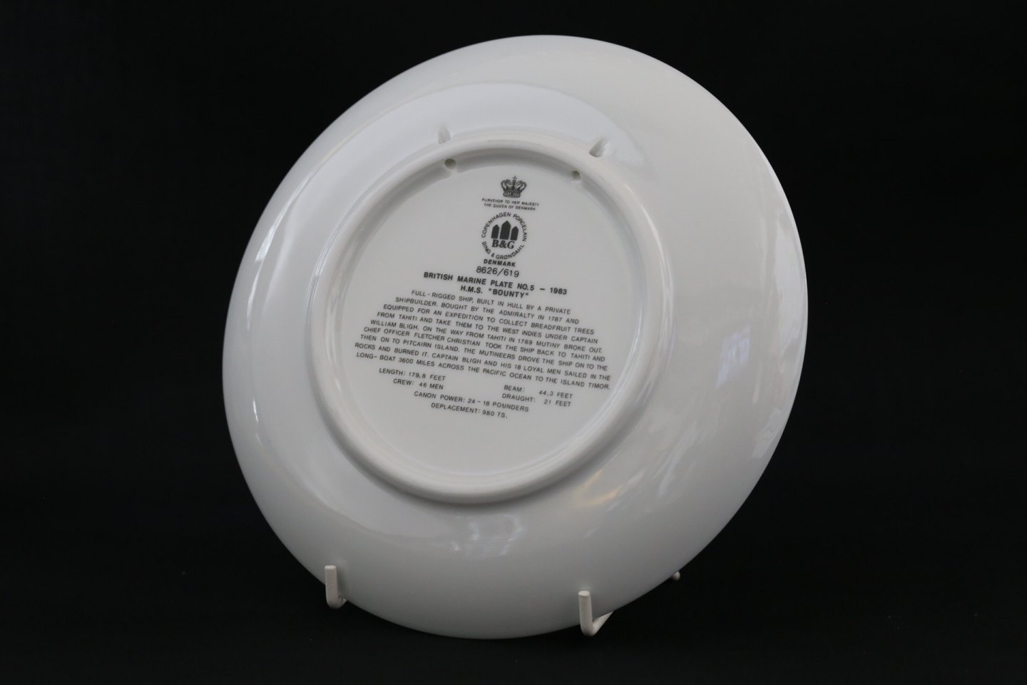 Skibsplatte Bing & Grøndal, No. 5, fra 1983. Platten er bemalet med Full Rigged Ship, med teksten 1784 H.M.S. Bounty 1790. Der er tekst om skibet på bagsiden af platten.