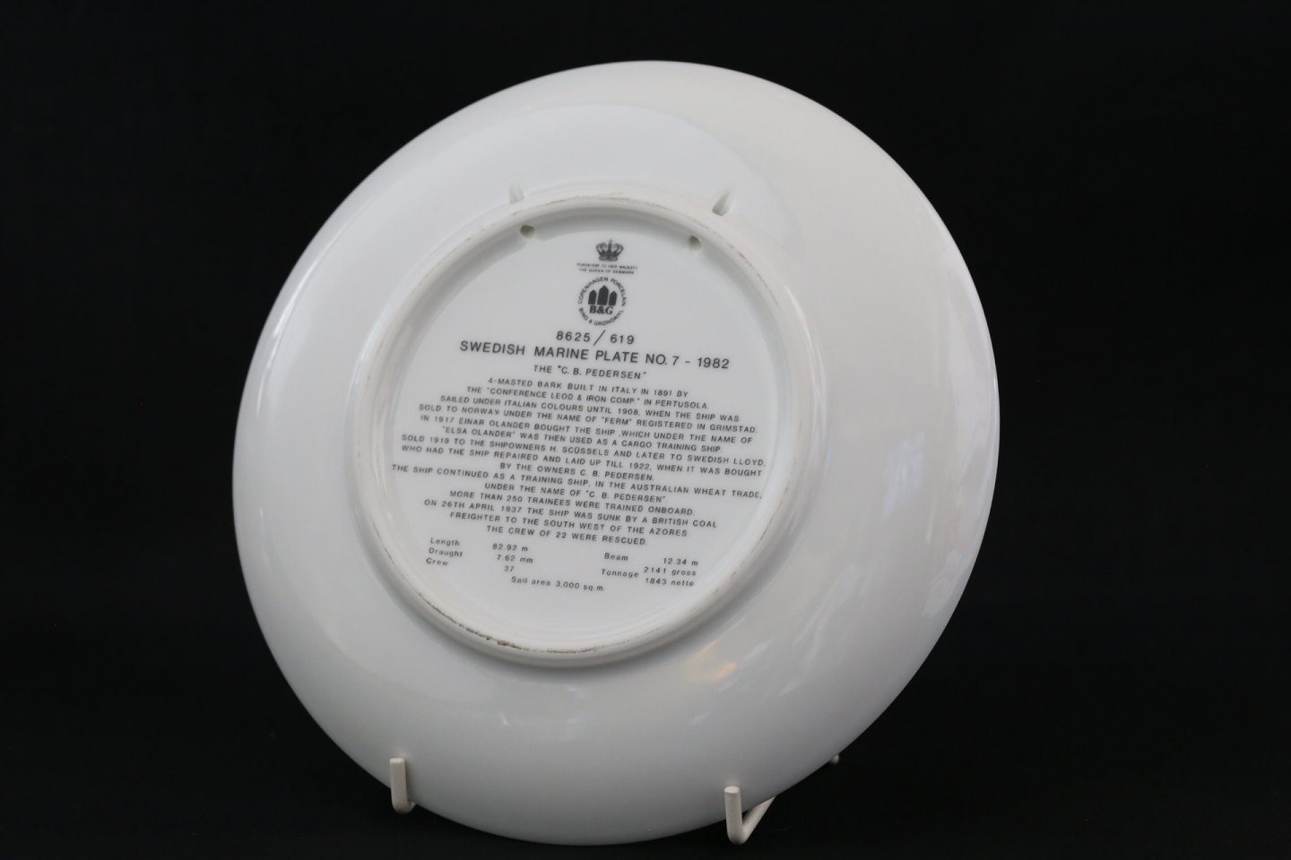Skibsplatte Bing & Grøndal, No. 7, fra 1982. Platten er bemalet med Skolskeppet, med teksten 1891 C.B.S.Pedersen 1937 Der er tekst om skibet på bagsiden af platten.