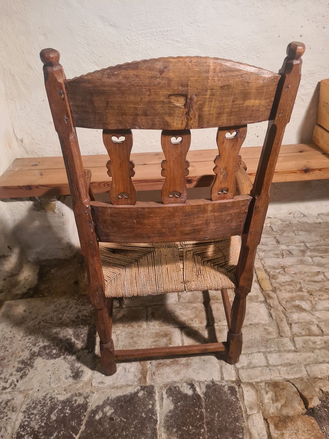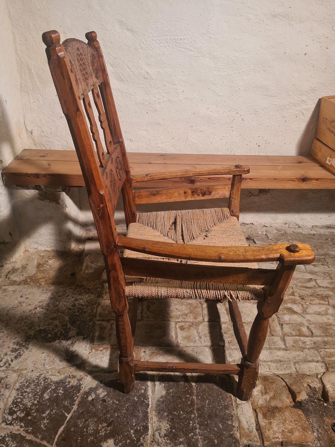 Gammel armstol med flet sæde. Fremstår pæn og udmærket stabil uden nævneværdige brugsspor.
