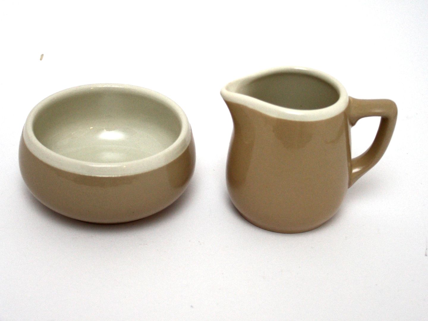 Aluminia, Hotelin serien, Sukker og fløde sæt i lysebrun med hvid kant gråt presset glas med spiralmønster. Designet af Nils Thorsson. Produceret i 1960-1973. Restaraution og hotelporcelæn.