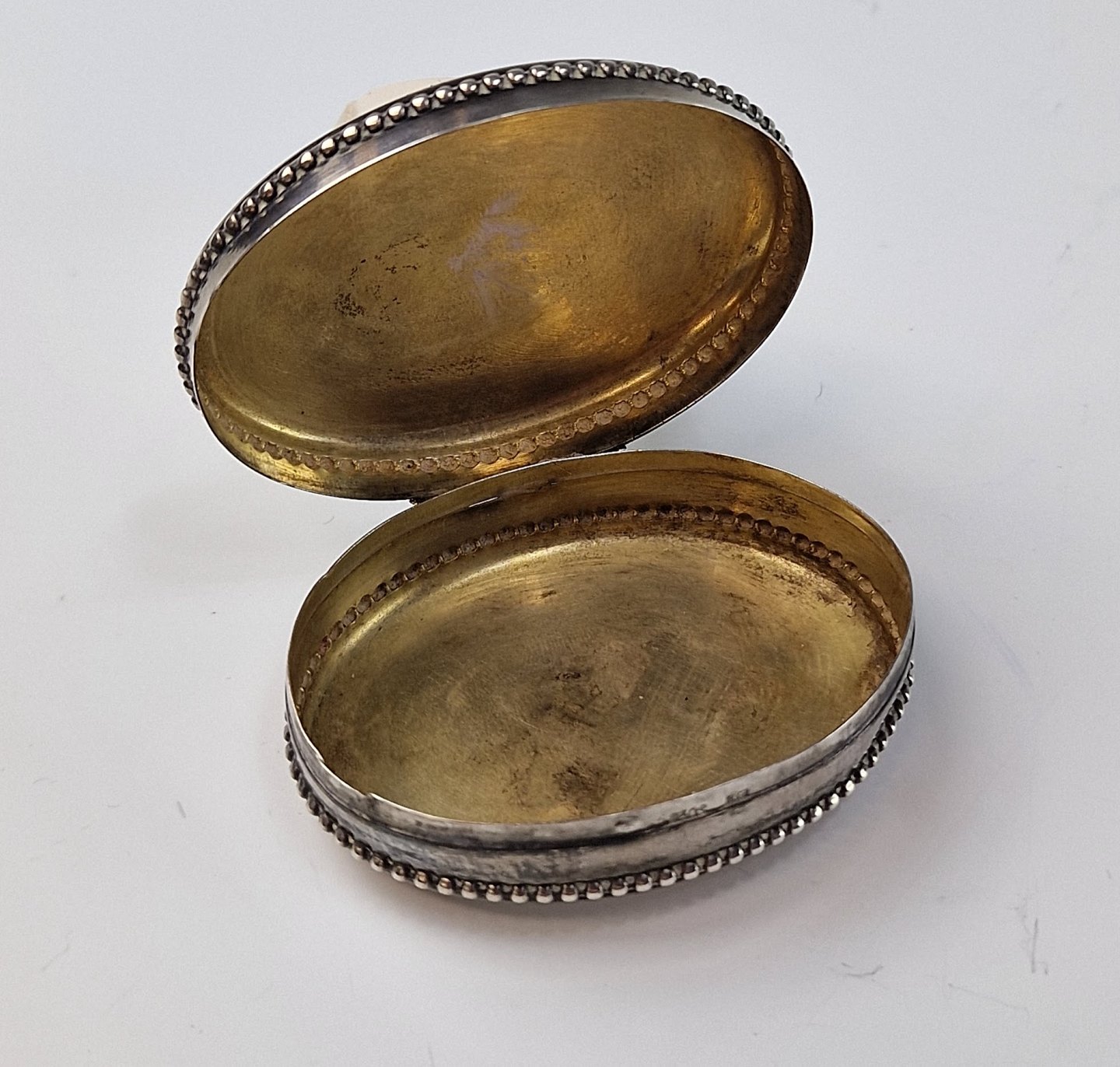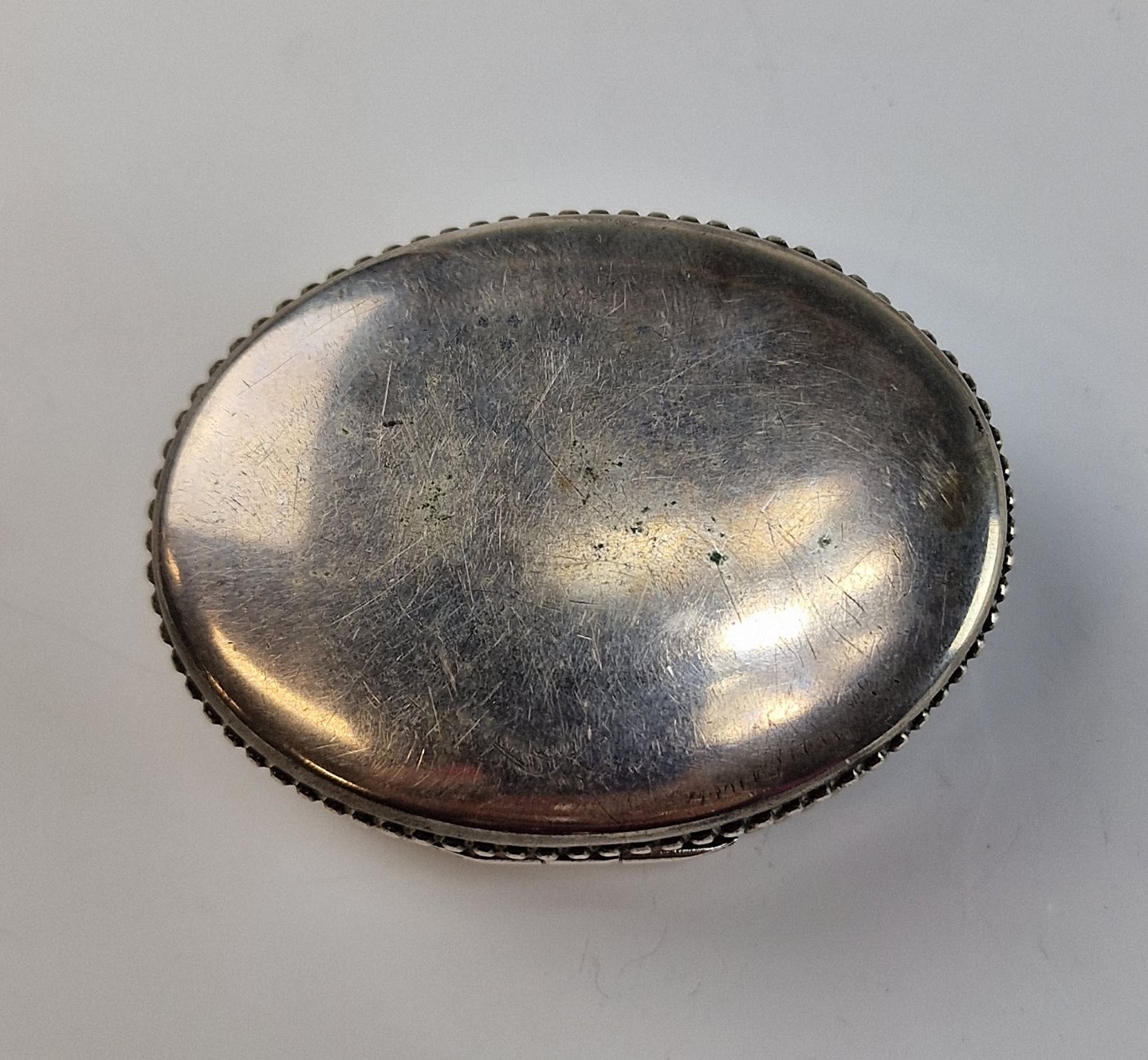 Oval pilleæske af sølv med inskriptionen Betty Wagle