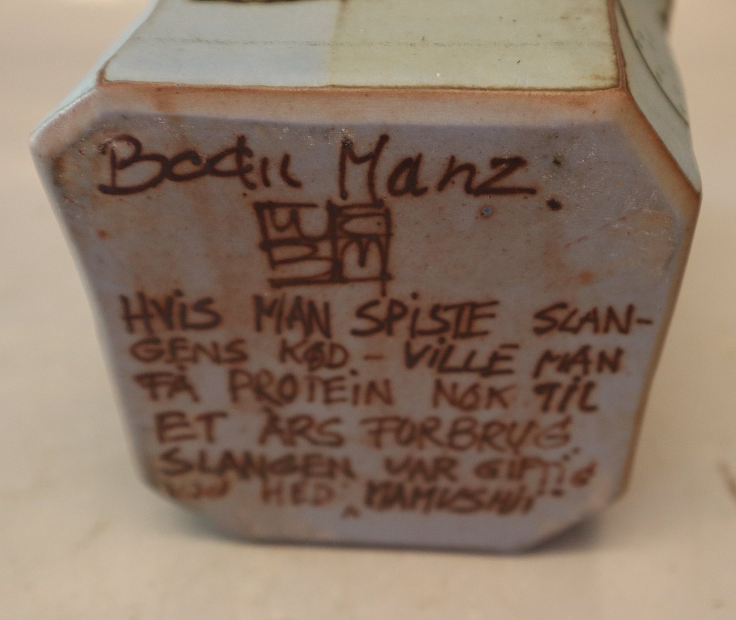 Mærke + tekst: Hvis man spiste slangens kød - ville man få protein nok til et års forbrug - slangen var giftig og hed "Mamushji"
