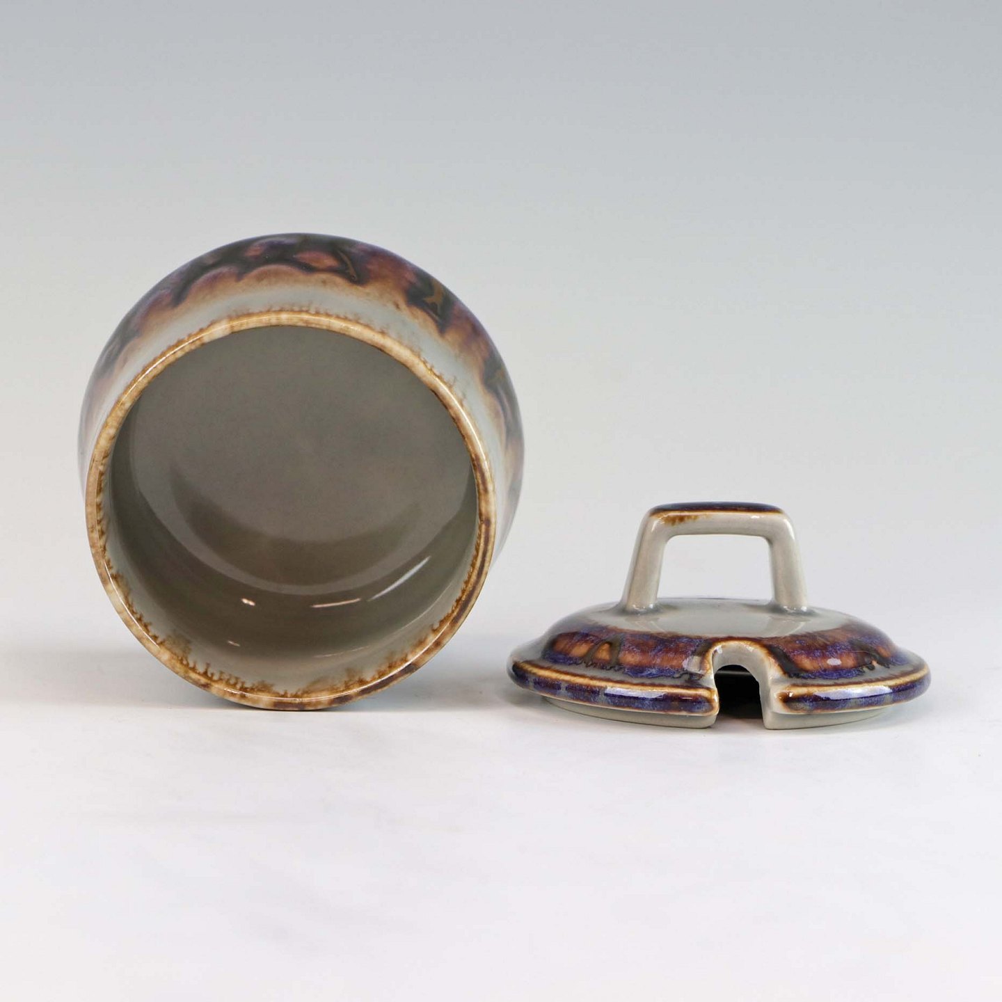 Krukke af stentøj, med låg og hul til ske, fra stellet Mexico. No 302