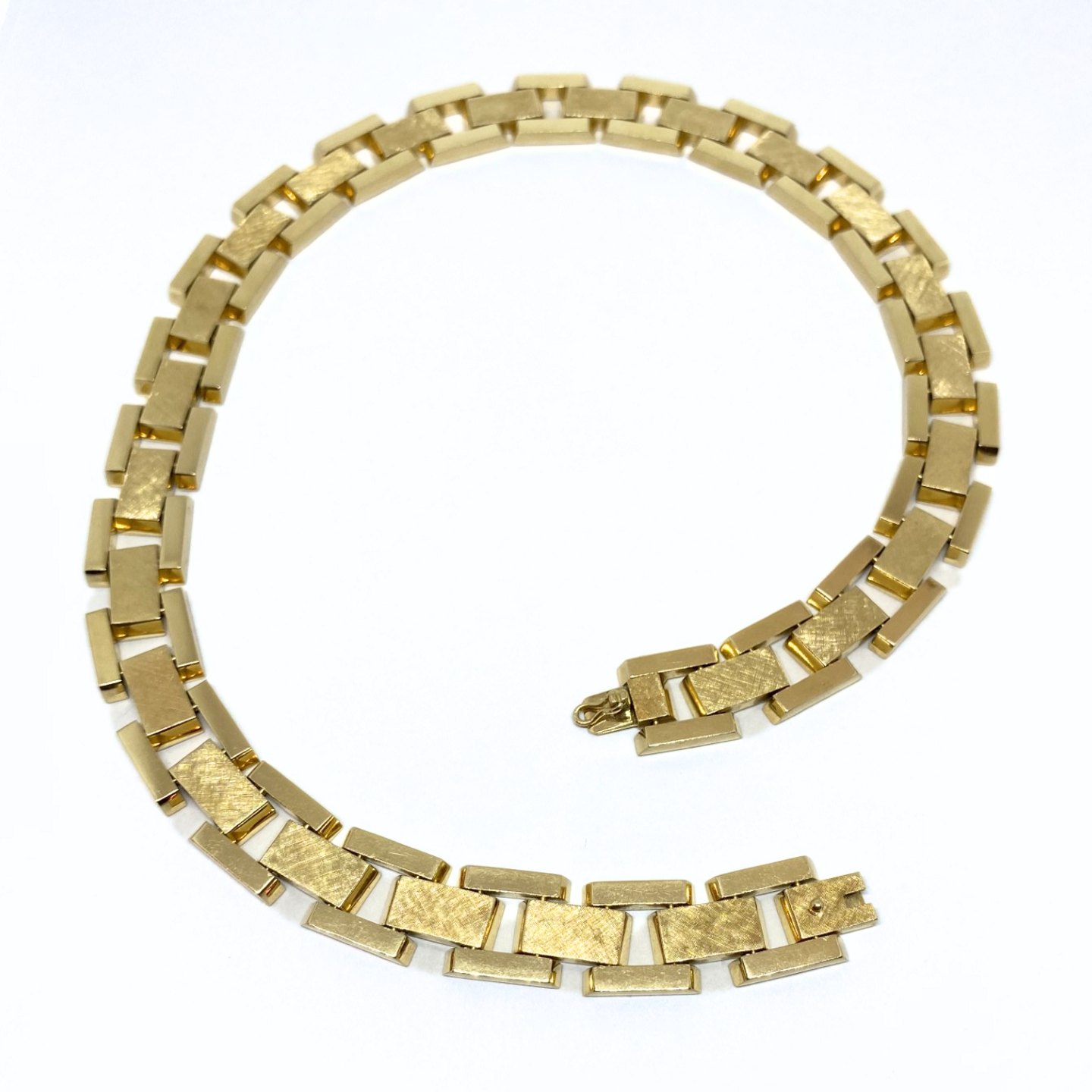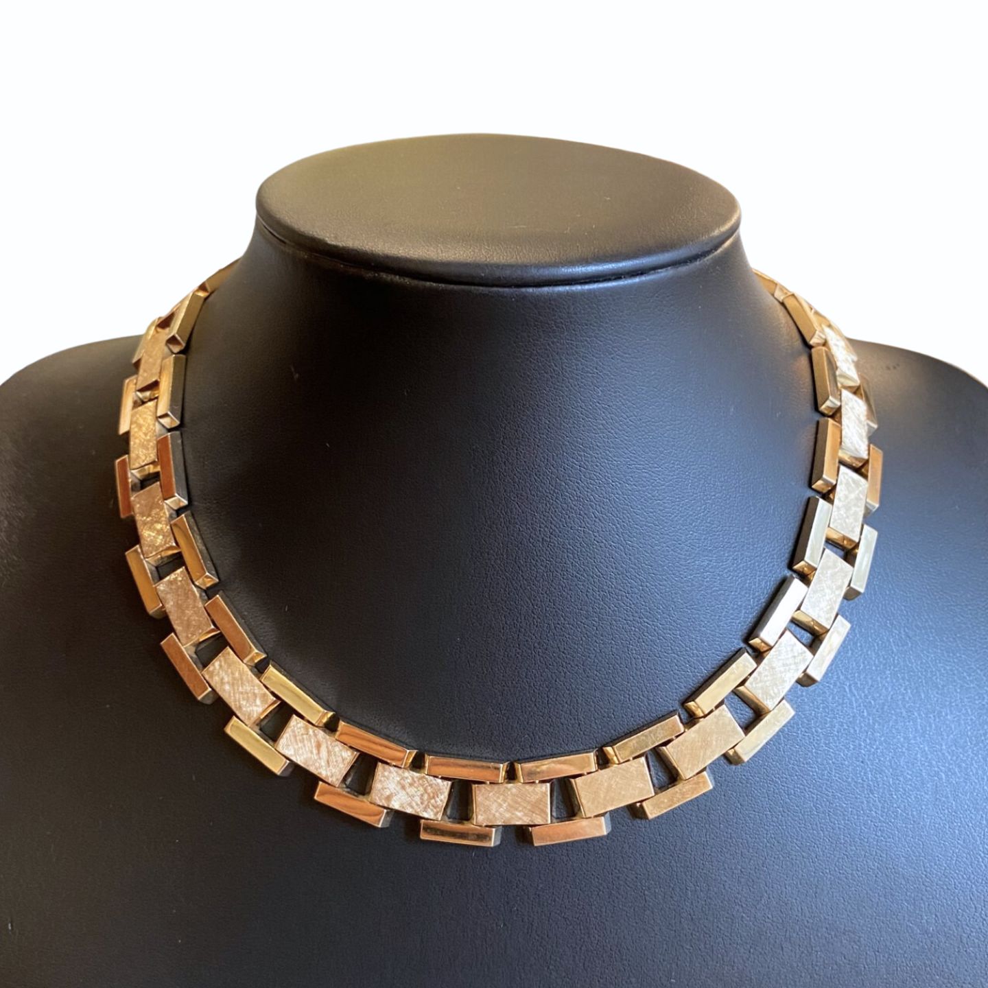Guldvirke; Halskæde i blokmønster af 14 kt. guld. Med matteret mønster på leddene i midten af kæden. Monteret med kasselås samt sikkerhedslås. Stemplet "Guldvirke 585".