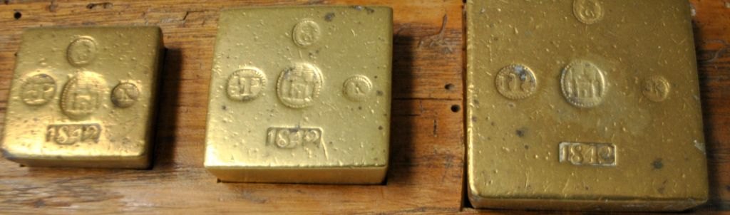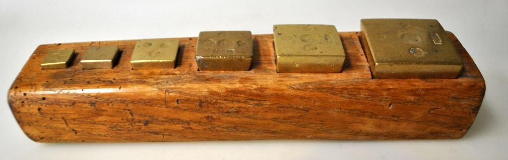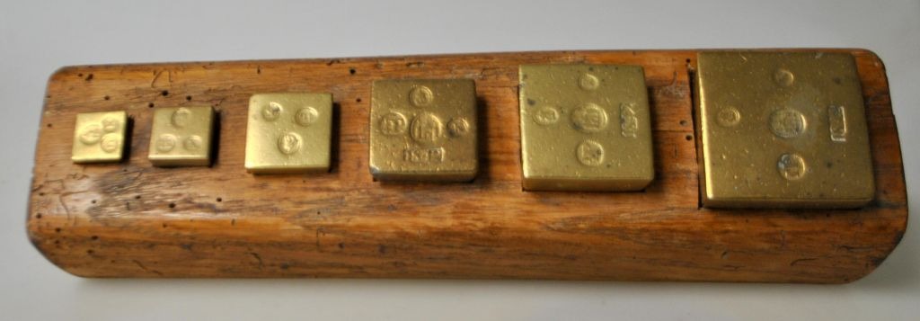 Set of Danish weights in brass, 1842. Among other things 1/4 pd, 1/2 pd and 1 pd. L.: 26 cm.
