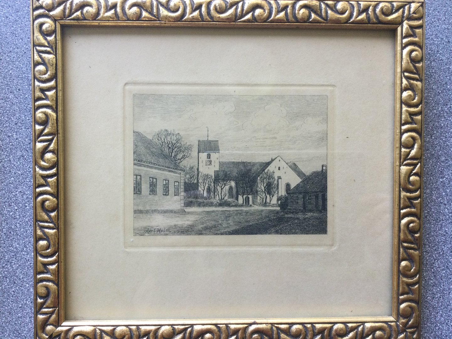 Radering af Axel Holm - Byparti med kirke