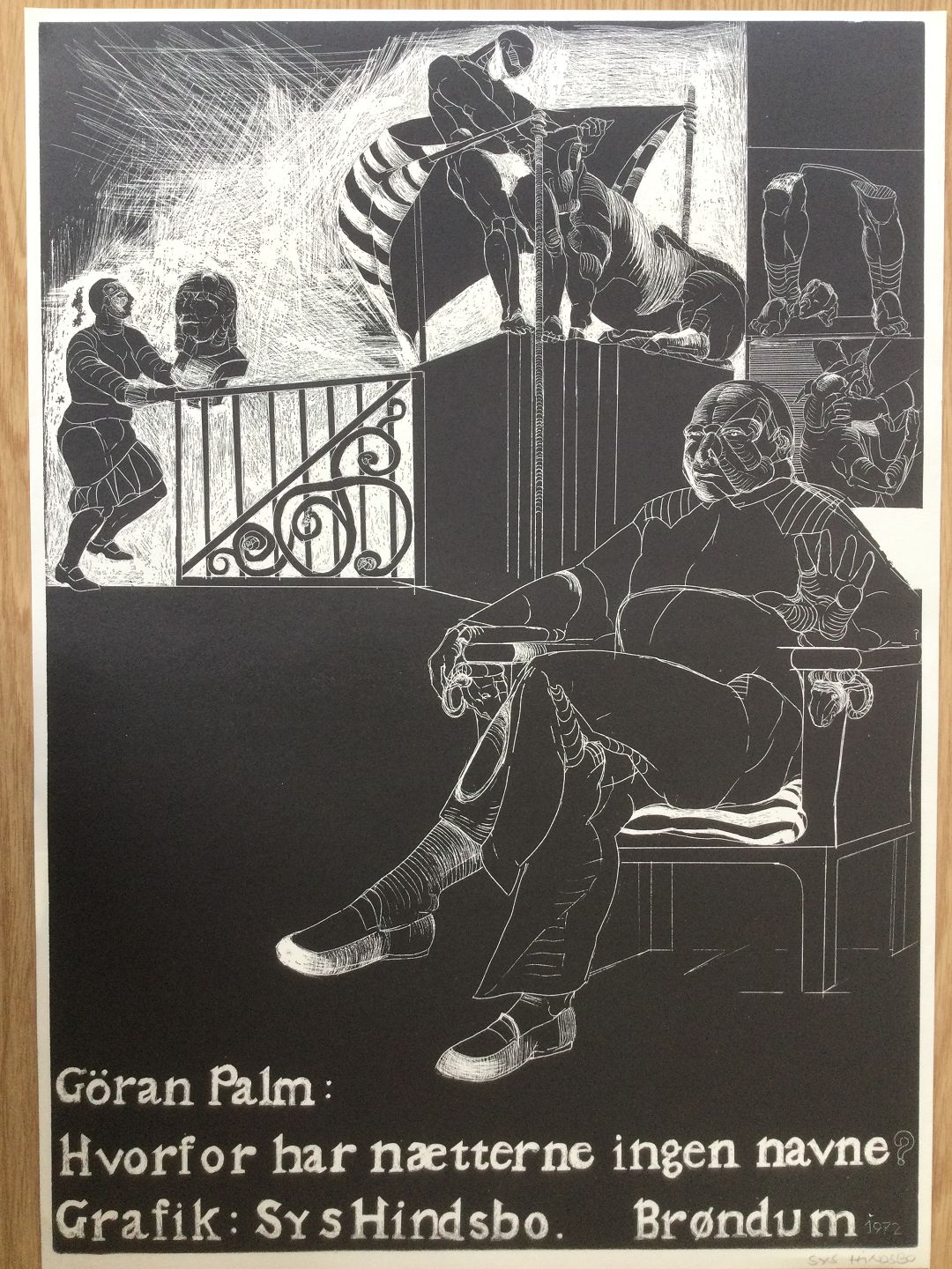 Træsnit af Sys Hindsbo - plakat for Göran Palms roman "Hvorfor har nætterne ingen navne?" 1972.