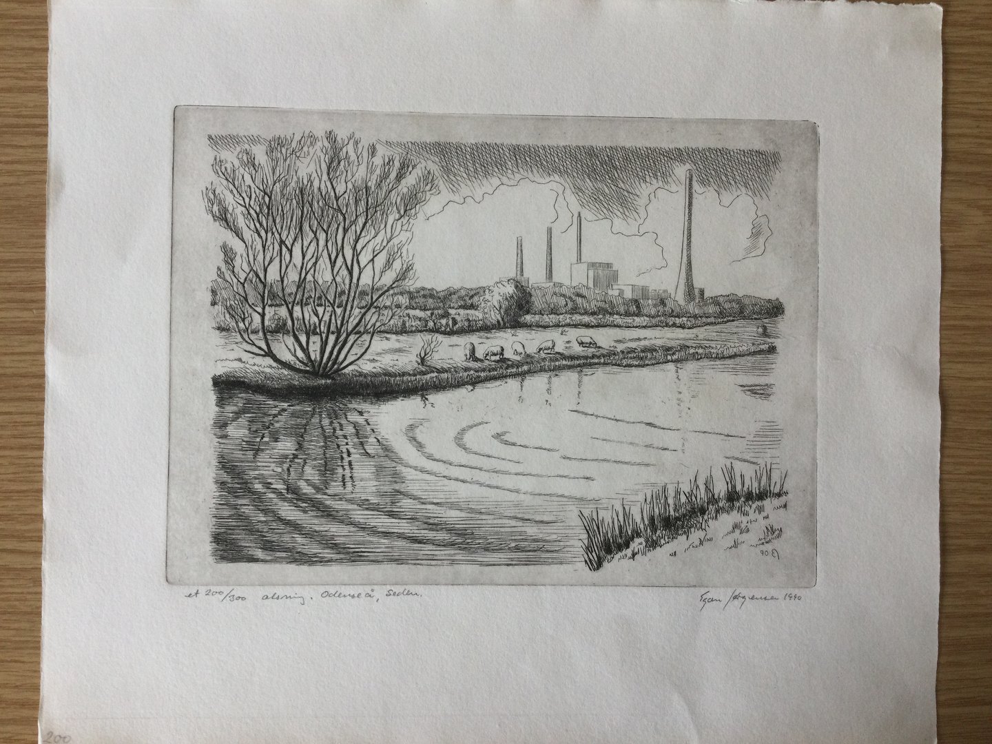 Ætsning af Egon Jørgensen 1990 - Fynsværket ved Odense å.