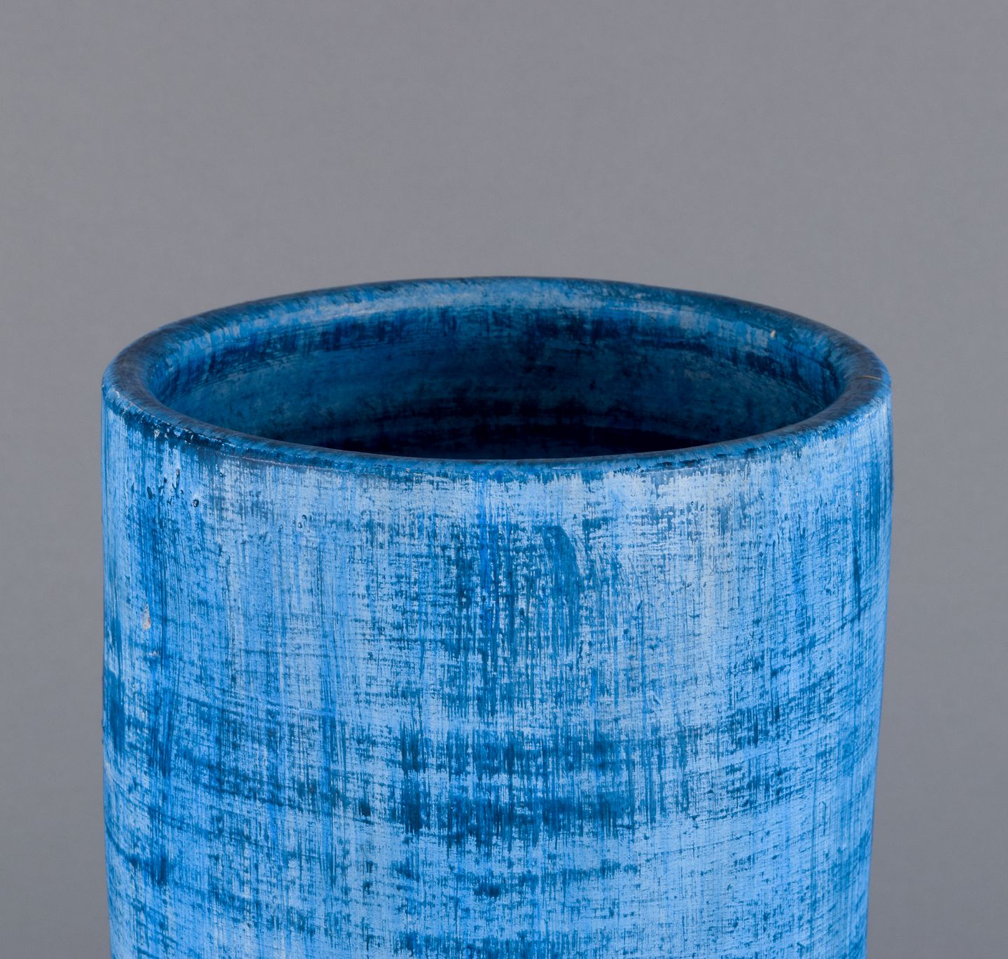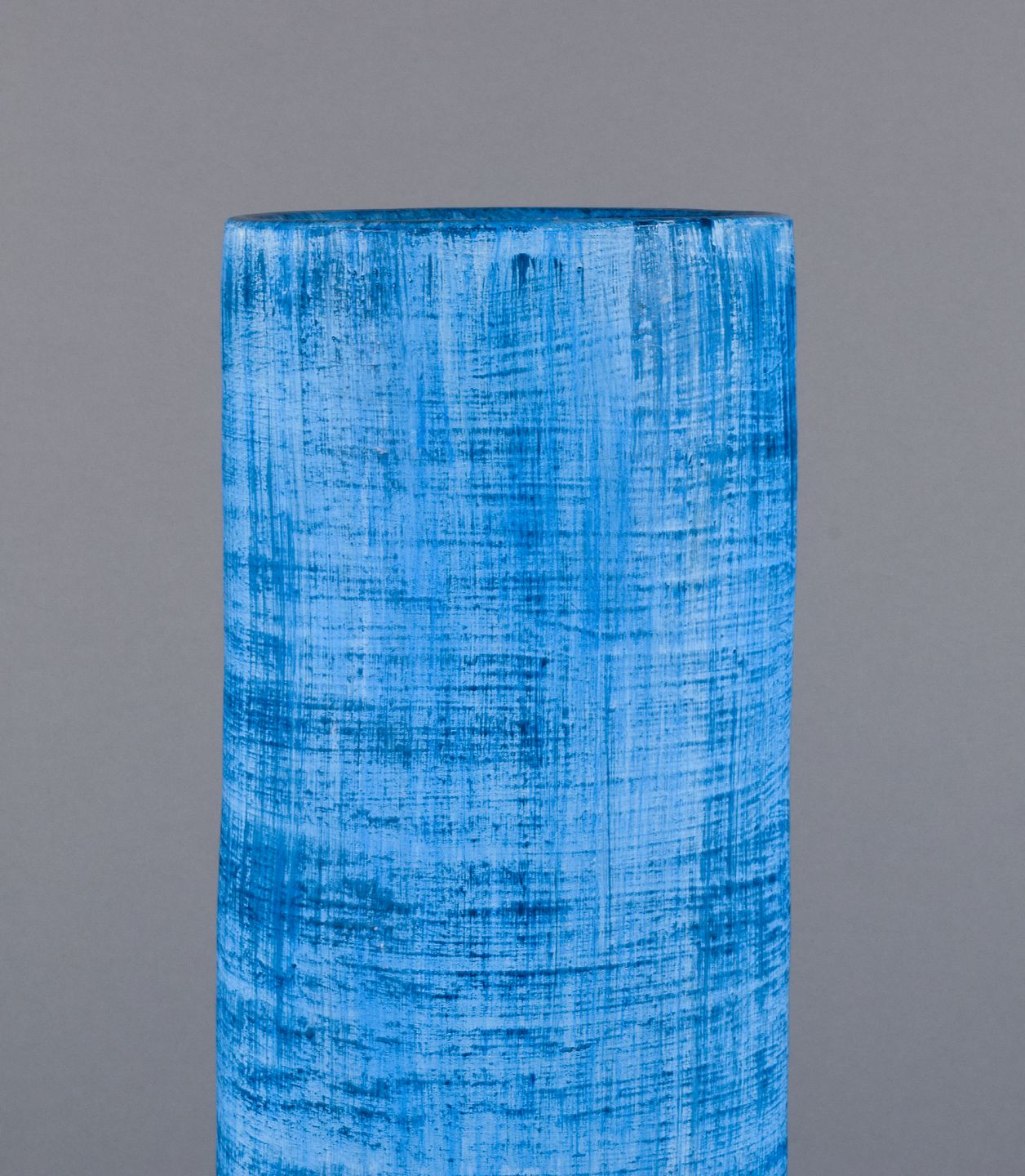 Kolossal cylinderformet gulvvase i keramik. Håndglaseret i blå nuancer.