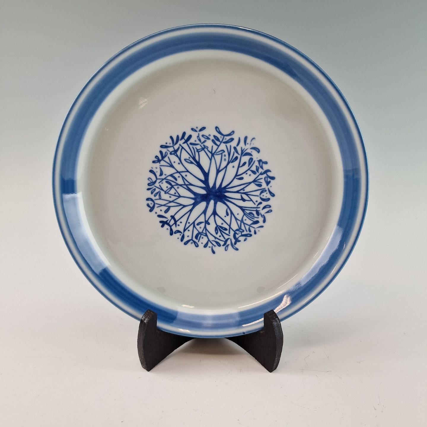 Stellets runde former er dækket med en silkeblød glasur og håndmalet med er lys almueblå farve lagt under glasuren. Stellet er ovnfast