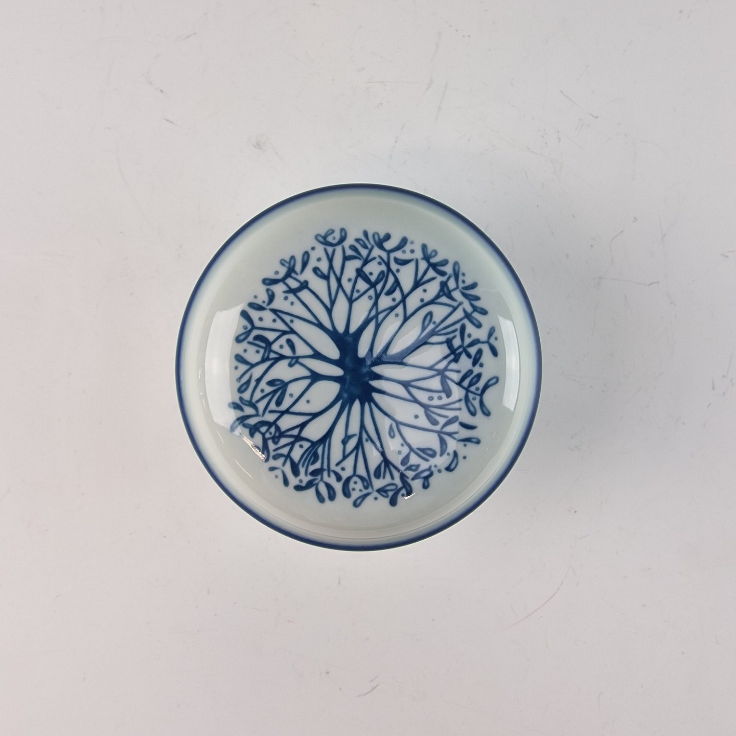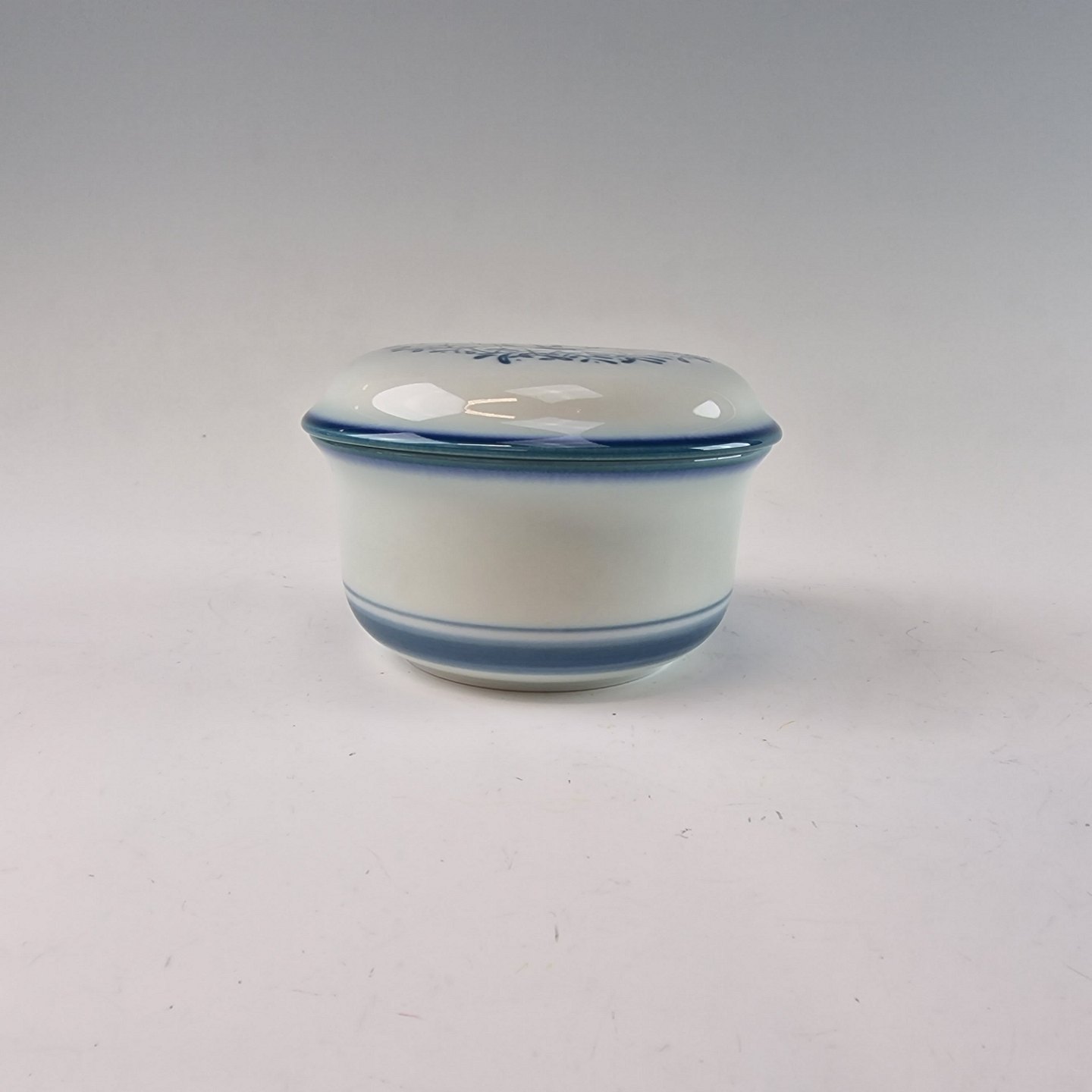 Stellets runde former er dækket med en silkeblød glasur og håndmalet med er lys almueblå farve lagt under glasuren. Stellet er ovnfast