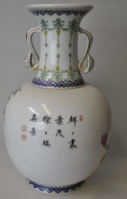 Chinese hand-painted porcelain vase, 20th century. Polychrome decorated with flowers and gilding. Stamped. H.: 30 cm.