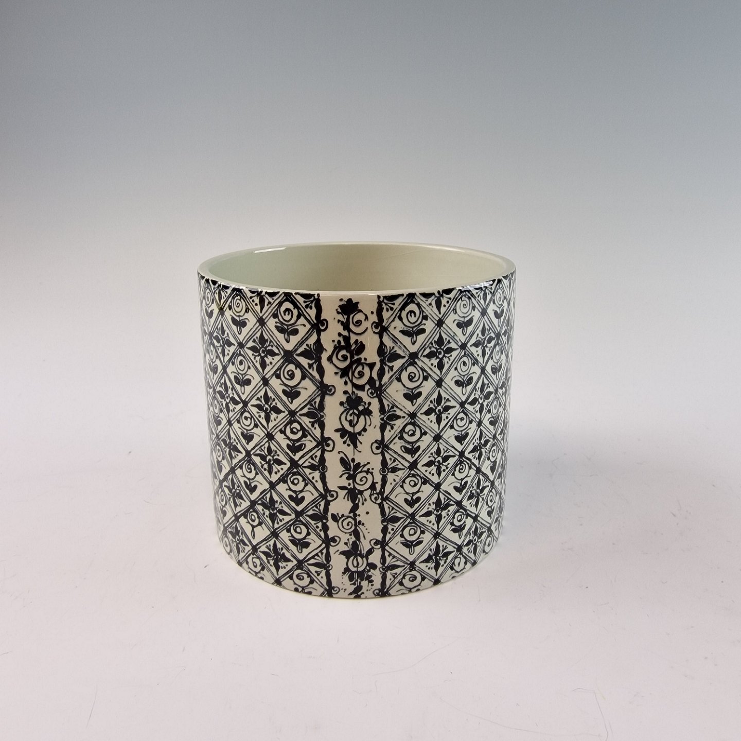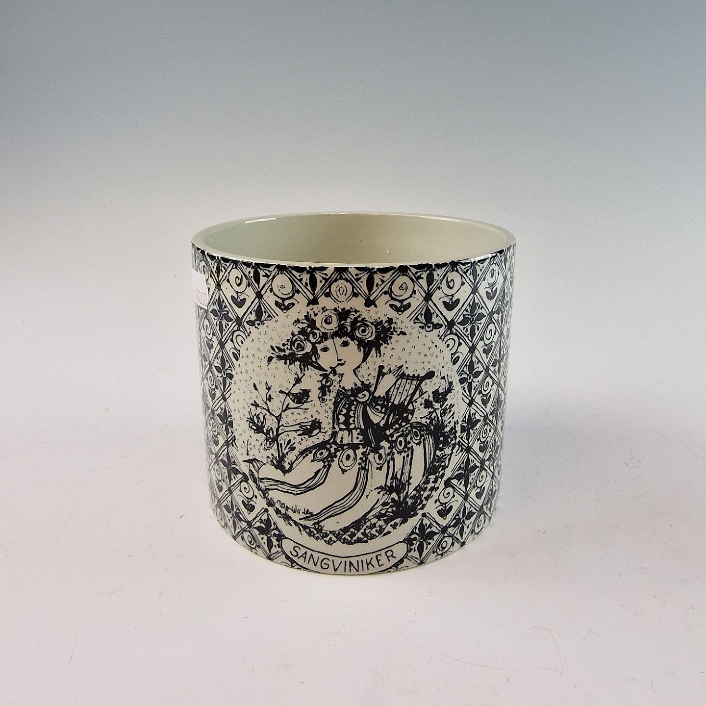 Urtepotteskjuler af porcelæn med det klassiske sort/hvide mønster af et kvindeansigt og blomster. Sangviniker fra serien "De fire temperamenter" No 3023-698