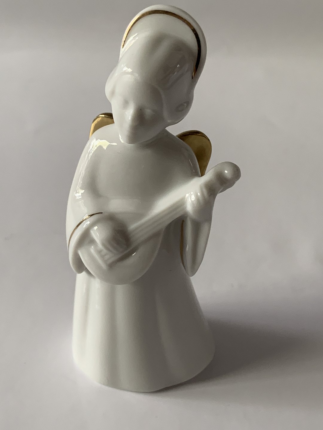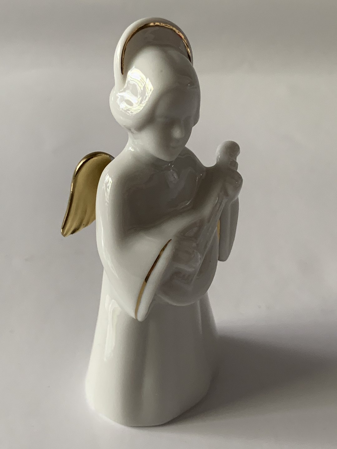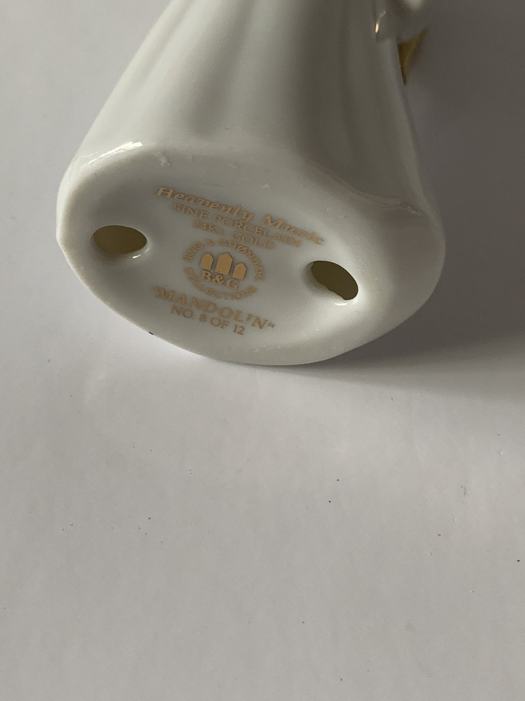 Bing & Grøndahl. Heavenly Music. Mandoline No. 8 af 12. Hvid porcelæns engel med guld staffering og guldvinger (24 karat). Serien hedder " Engel med Instrumenter" og består af 12 stk.
