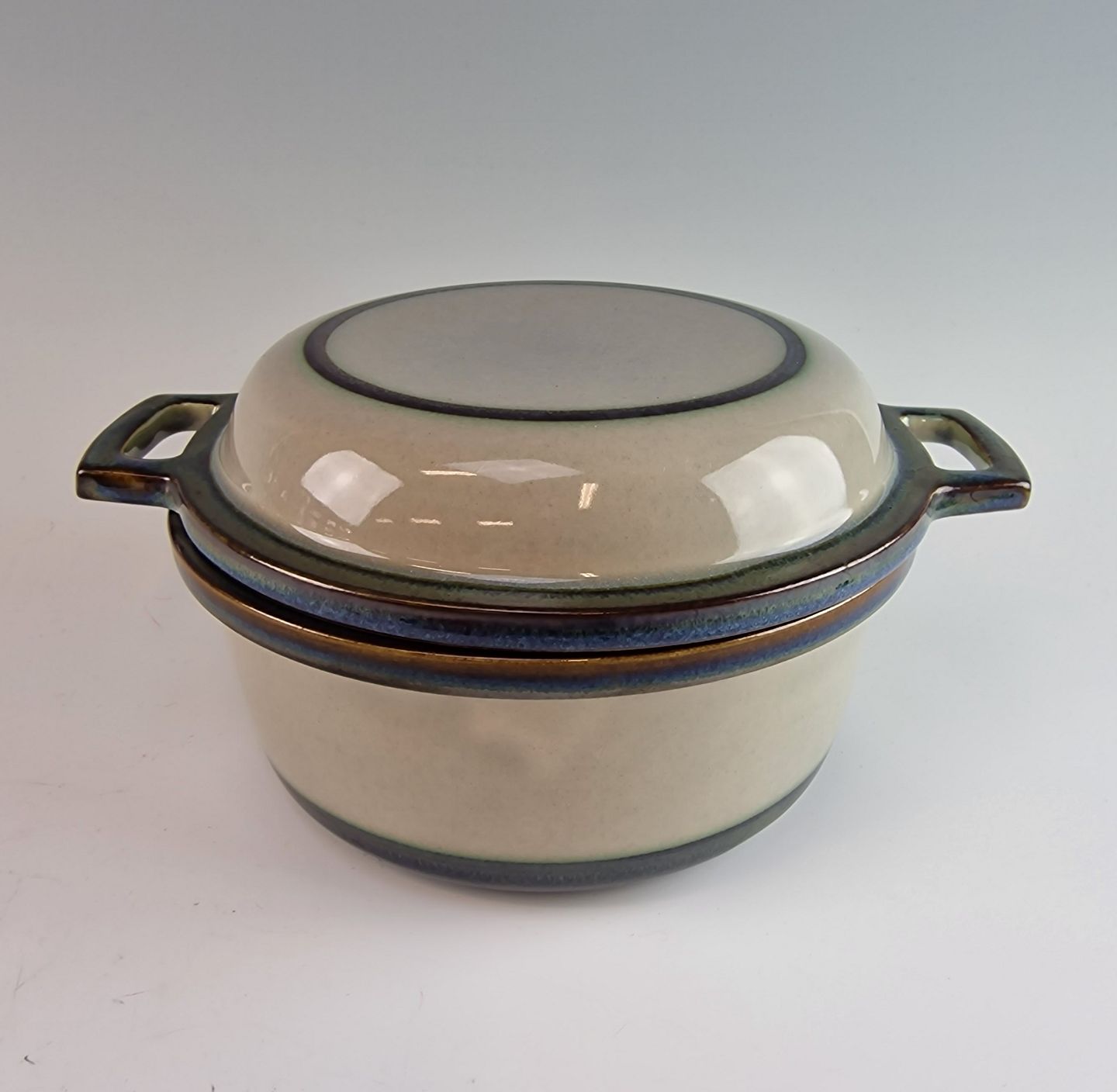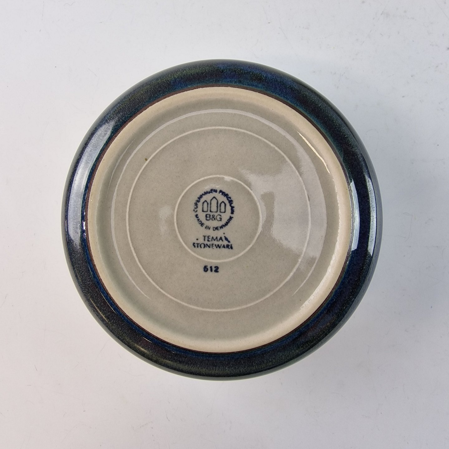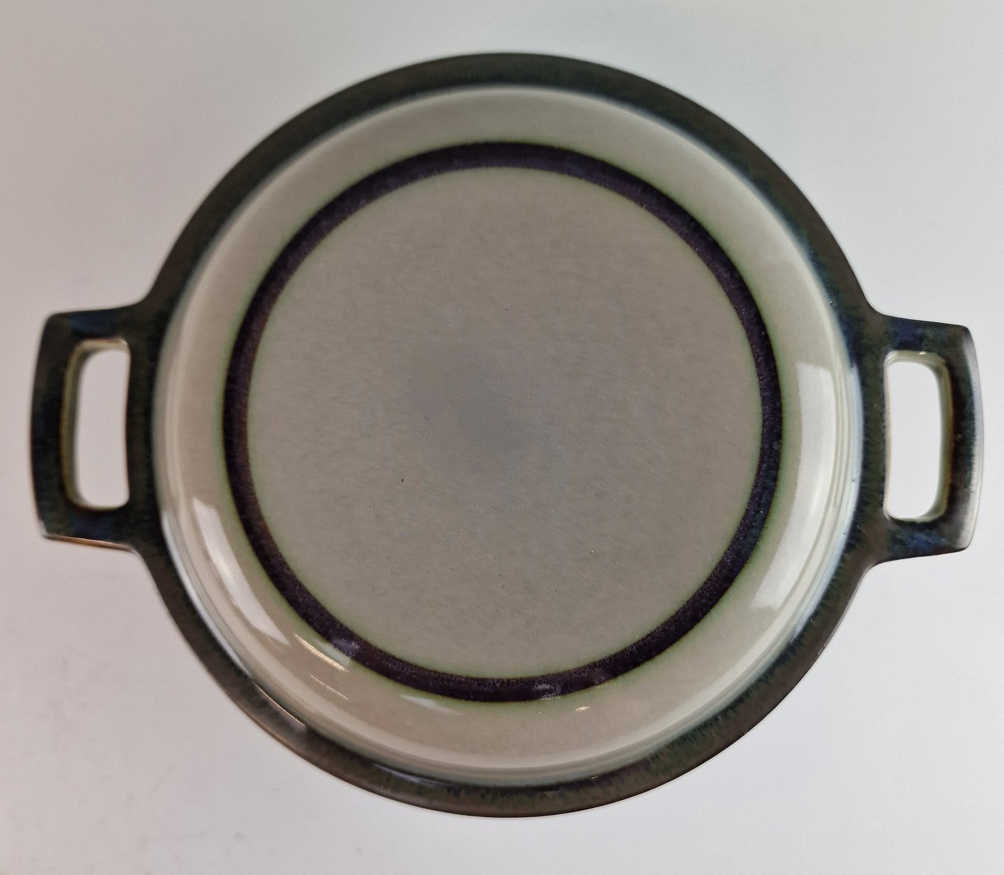 Stellet Tema er af stentøj, glaseret med lys grå og dekoreret med kanter af grønne og brune farver