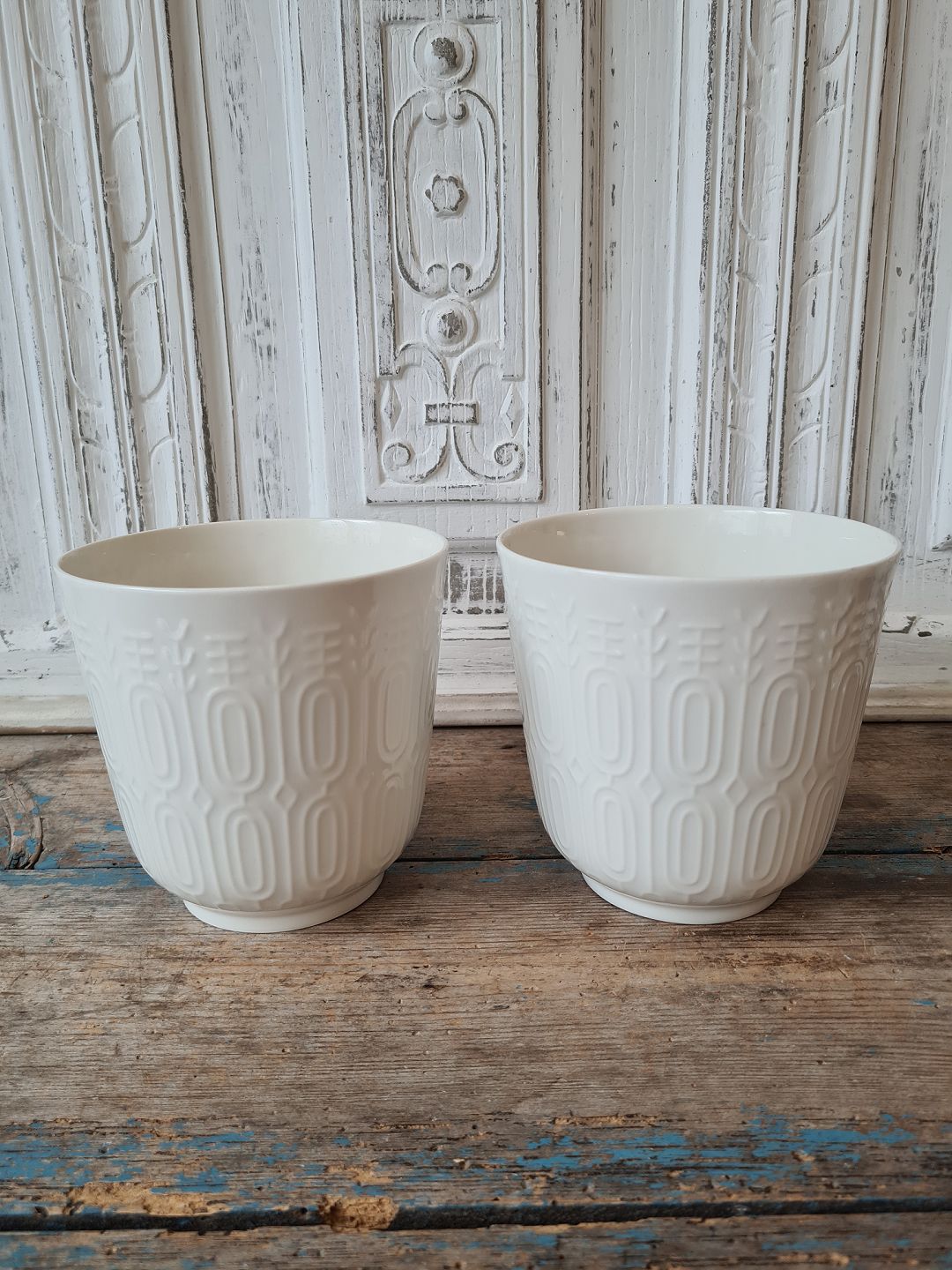 Royal Copenhagen par urtepotteskjulere i Blanc de Chine dekoreret med geometrisk mønster i relief