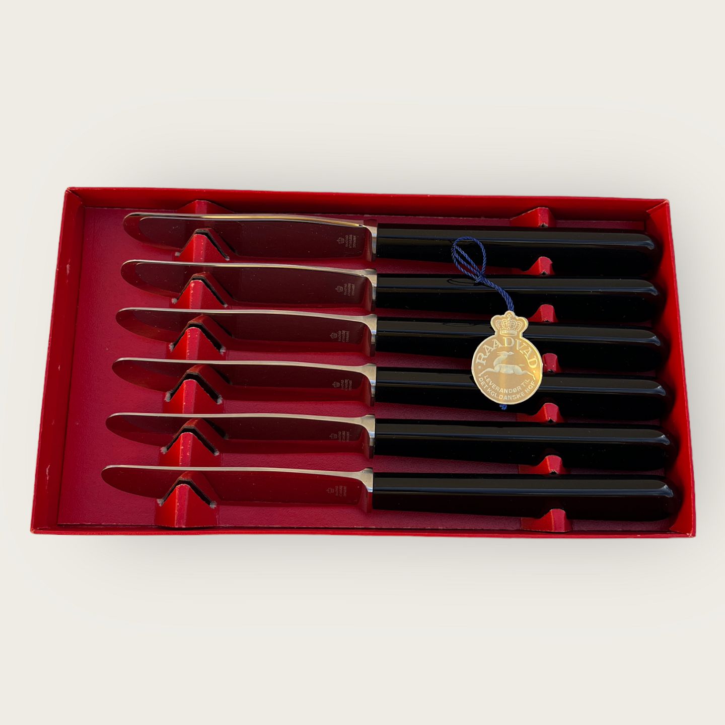 Raadvad, Middagsknive med skaft i sort kunststof og blad i rustfrit stål, Sæt med 6 stk. i æske, 21cm lang *Perfekt stand*
